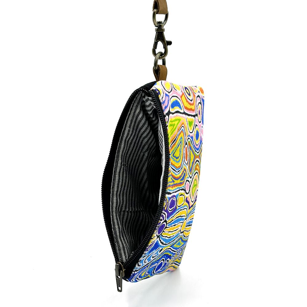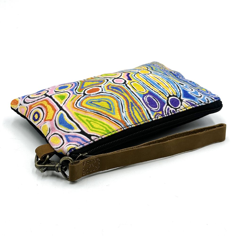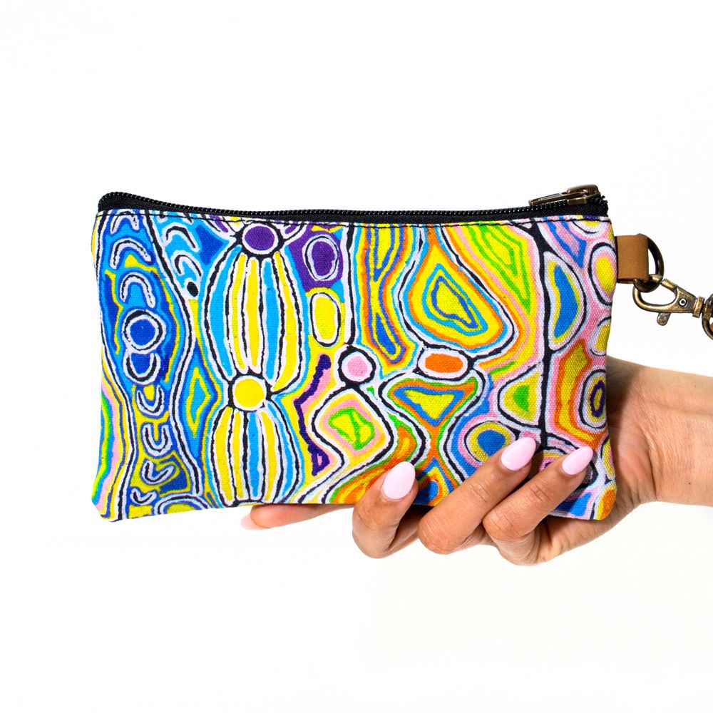 This story tells of the journey of a group of women of all ages who travelled to the east gathering food, collecting 'ngalyipi' (snake vine) and performing ceremonies as they travelled. The wavy lines represent the snake vine, the 'u' shapes the women, the circular shapes are edible mushrooms the women collect on their travels and the two straight lines in the middle represent digging sticks.