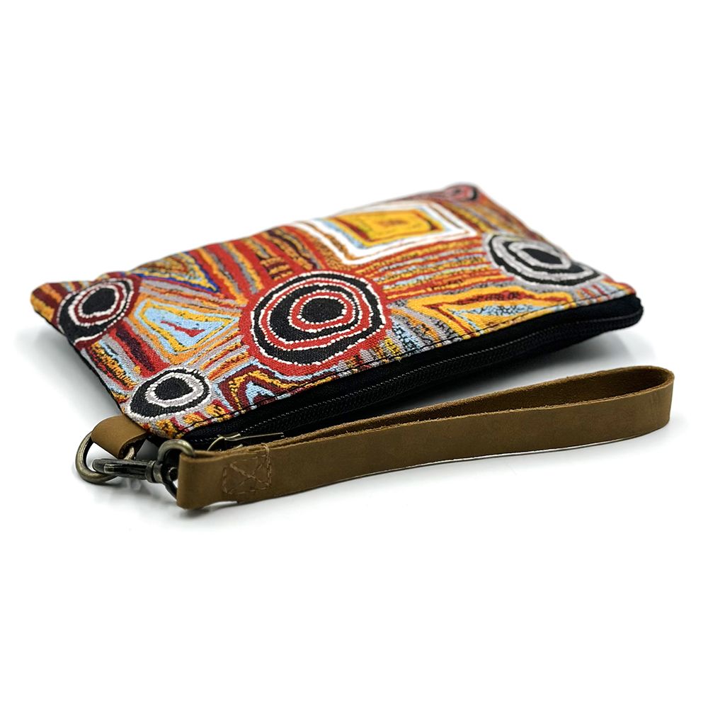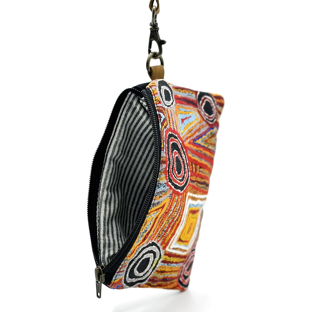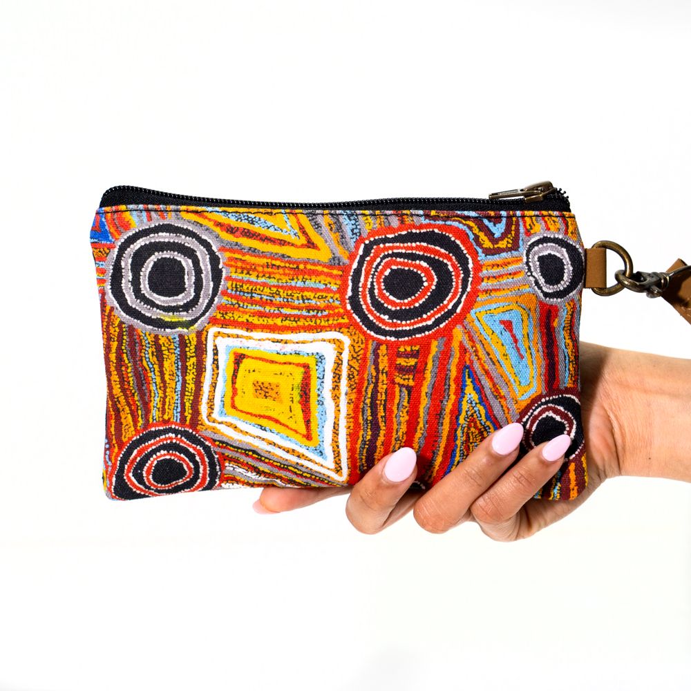 This painting depicts linear pattern 'body paint design'. The Aboriginal women paint their breasts and shoulders for ceremonies, which include song and dance used to tell their ancient stories. The concentric circles symbolise ceremonies or meeting place.
