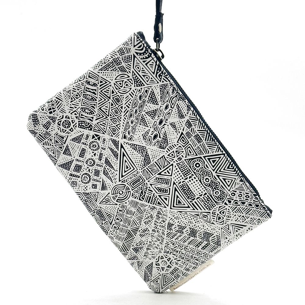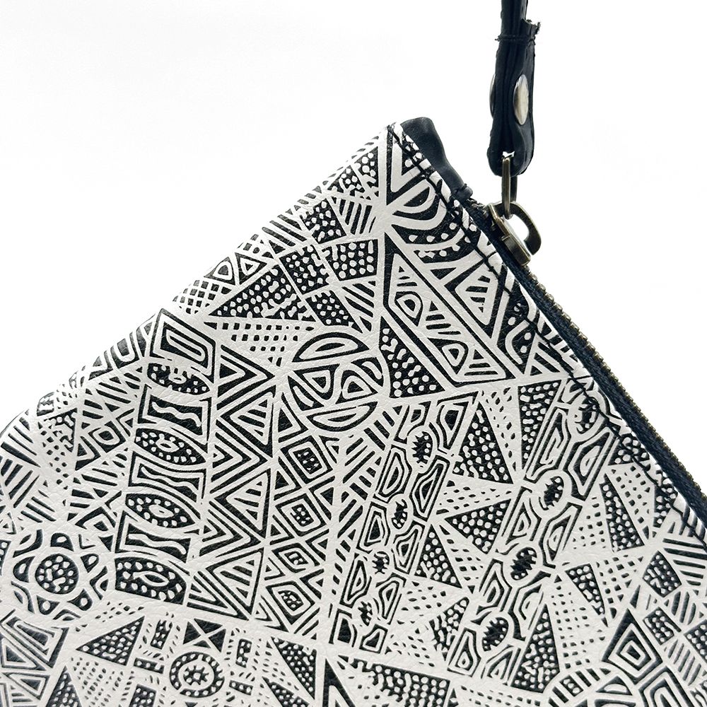 Simplicia paints a story about an old lady who travelled around with her six kids looking for food and water. When the old lady couldn’t find anything, she started making a hole and then the water came out. Lots of different animals came to the waterhole. The old lady made four islands like Darwin, Bathurst and here (Melville Island). She made the waters and all the sea animals like crabs, barramundis, mud mussels, longbums, stingrays, turtles, dugongs, fishes that were good for food. Then she made the islands. The old lady travelled with her kids on her back, making the islands. Old and young people came and they were making a fire and dancing around it. They were happy for all the water everywhere.