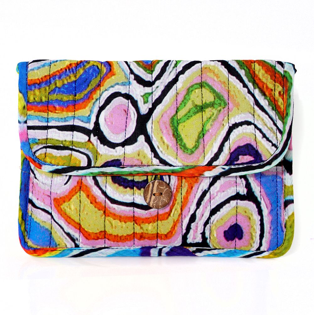 This story tells of the journey of a group of women of all ages who travelled to the east gathering food, collecting 'ngalyipi' (snake vine) and performing ceremonies as they travelled. The wavy lines represent the snake vine, the 'u' shapes the women, the circular shapes are edible mushrooms the women collect on their travels and the two straight lines in the middle represent digging sticks.