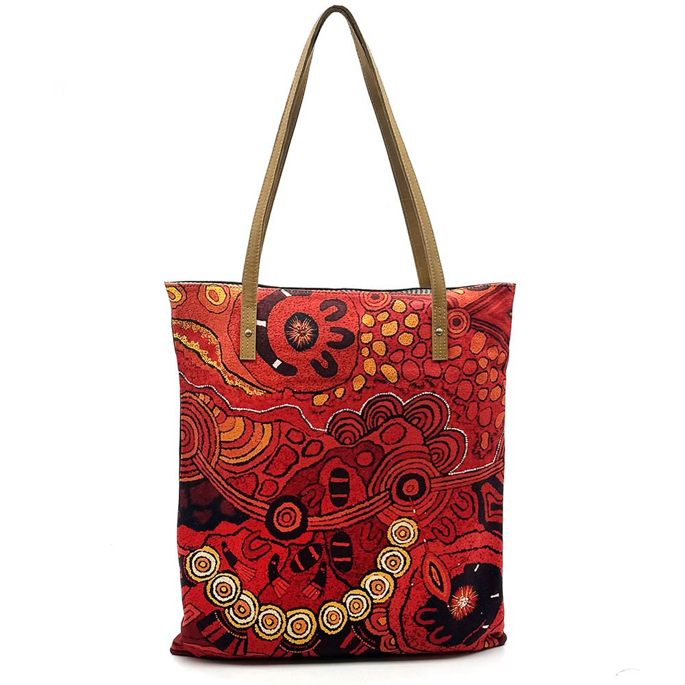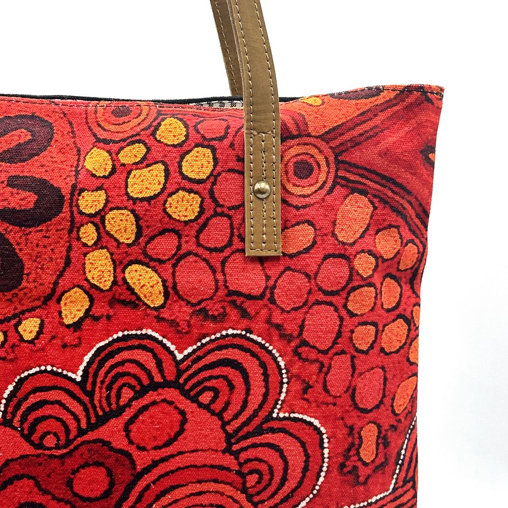 This piece tells the story of Yilpis grandfather and the hailstorm that killed him. As a young man he was stubborn and didn't listen to the elders that a big storm was coming. He went out hunting before the storm. He also wanted to perform a ceremonial dance to ward of the storm. He took the ceremonial dancing sticks, but didn't return. The rest of the clan hid in the caves to wait out the storm and afterwards, the women went searching for the man but could not find him. In another area of the country, the children were gathering bush foods and swimming in the newly filled rockholes. Quite by accident, they happened upon the body of the young man. He had died during the storm. This story is told to the children to teach them the importance of listening to their elders.
