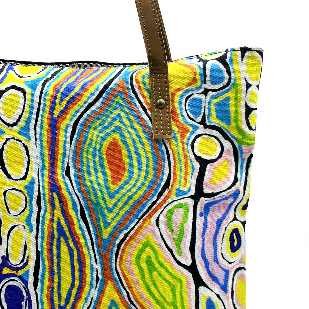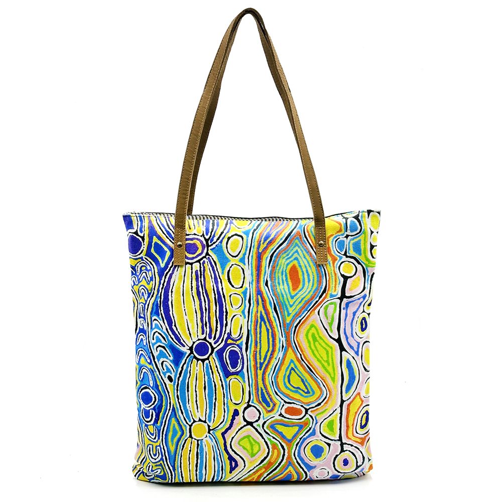 This story tells of the journey of a group of women of all ages who travelled to the east gathering food, collecting 'ngalyipi' (snake vine) and performing ceremonies as they travelled. The wavy lines represent the snake vine, the 'u' shapes the women, the circular shapes are edible mushrooms the women collect on their travels and the two straight lines in the middle represent digging sticks.