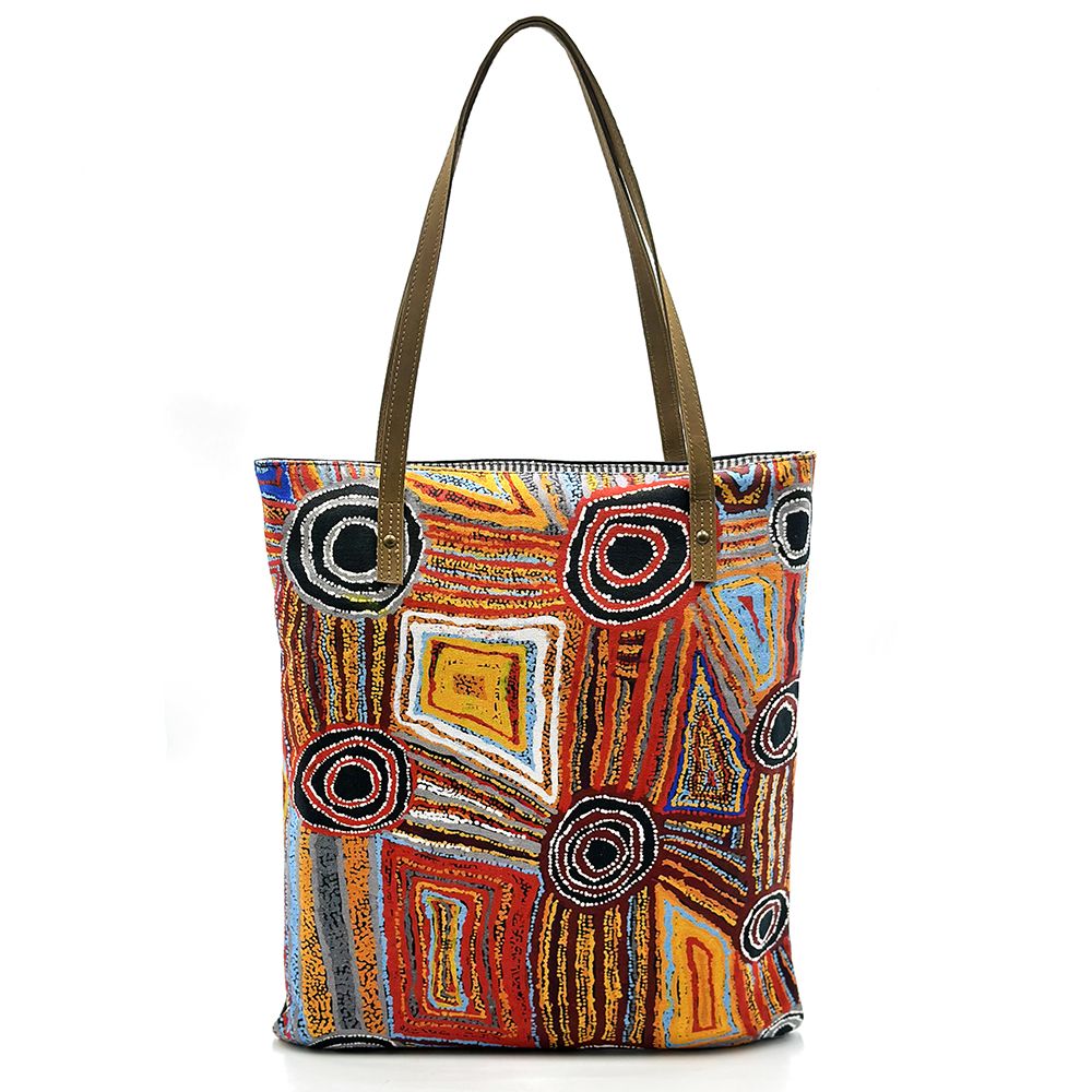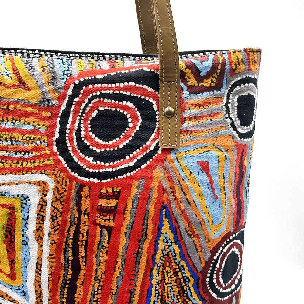 This painting depicts linear pattern 'body paint design'. The Aboriginal women paint their breasts and shoulders for ceremonies, which include song and dance used to tell their ancient stories. The concentric circles symbolise ceremonies or meeting place.