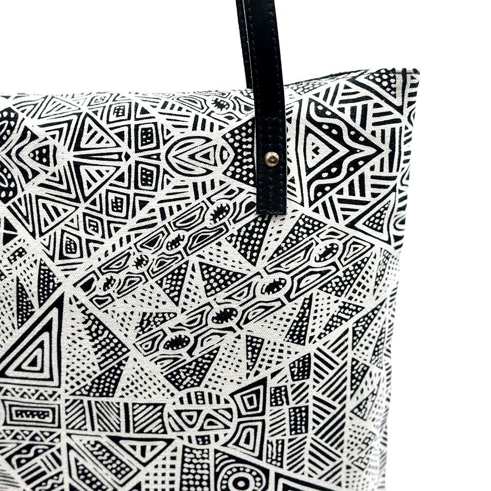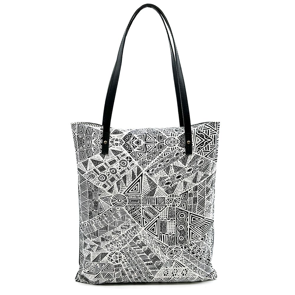 Simplicia paints a story about an old lady who travelled around with her six kids looking for food and water. When the old lady couldnt find anything, she started making a hole and then the water came out. Lots of different animals came to the waterhole. The old lady made four islands like Darwin, Bathurst and here (Melville Island). She made the waters and all the sea animals like crabs, barramundis, mud mussels, longbums, stingrays, turtles, dugongs, fishes that were good for food. Then she made the islands. The old lady travelled with her kids on her back, making the islands. Old and young people came and they were making a fire and dancing around it. They were happy for all the water everywhere.