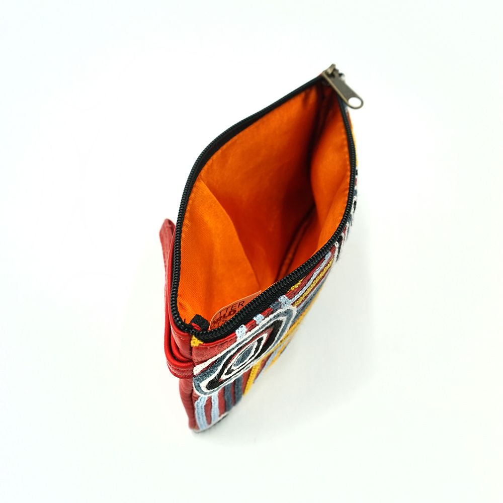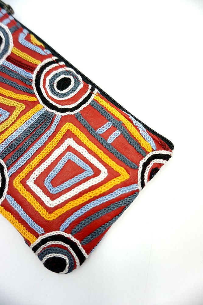 This painting depicts linear pattern 'body paint design'. The Aboriginal women paint their breasts and shoulders for ceremonies, which include song and dance used to tell their ancient stories. The concentric circles symbolise ceremonies or meeting place.