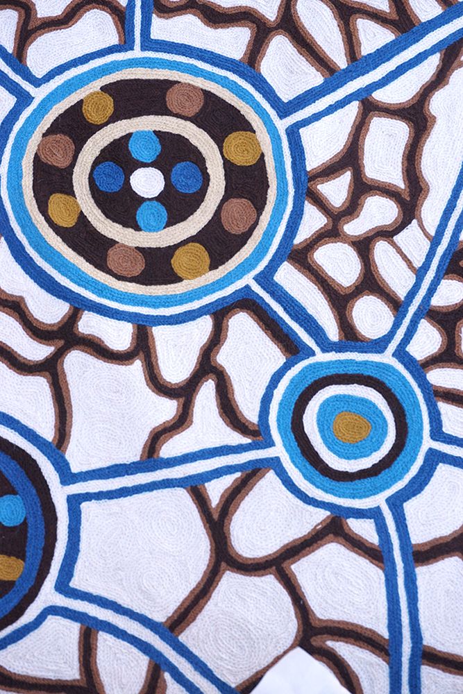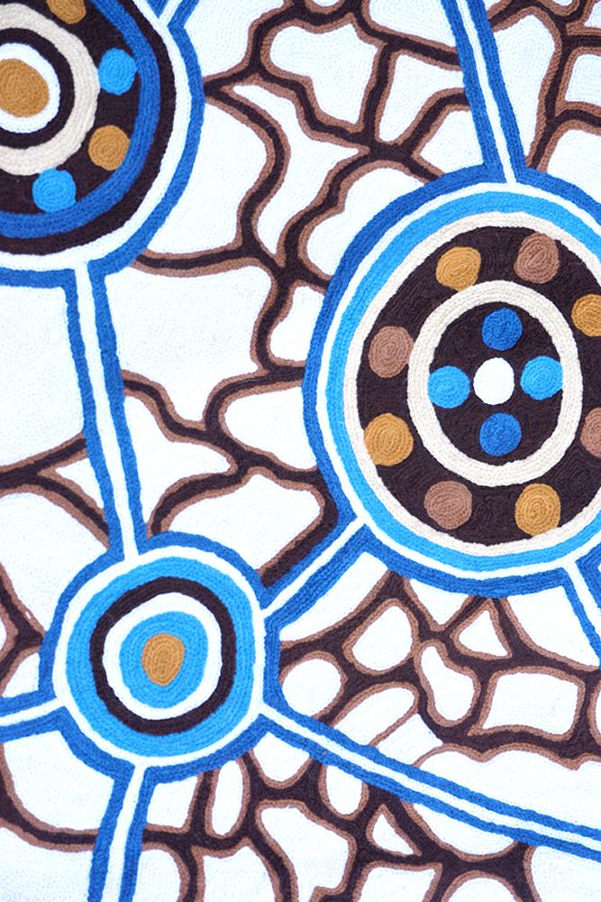 Using a gentle pallet of earth tones and blues Bianca describes the migration patterns of her ancestors that created a network of Aboriginal culture across Australia. Traditional migration patterns were age old, defined by various landmarks and natural resources. These migration patterns worked in harmony with the seasons and the natural environment.