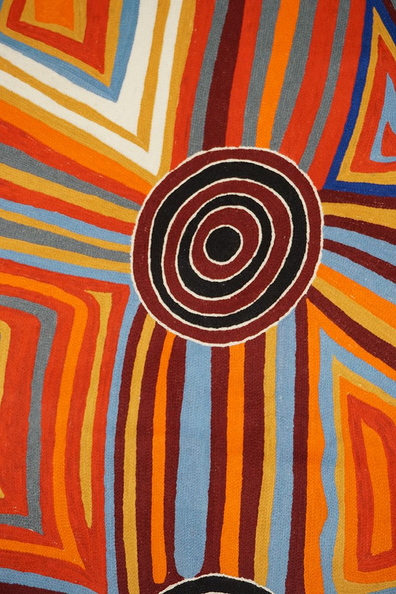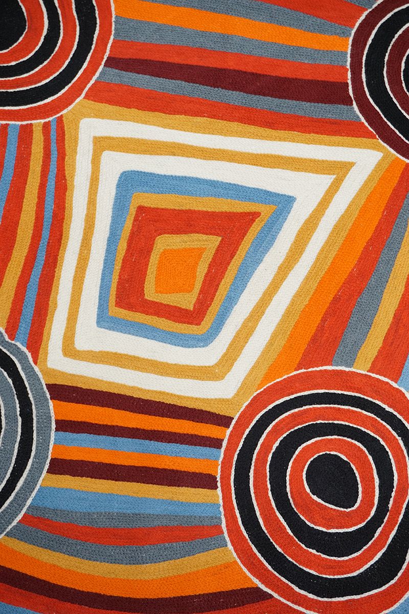 This painting depicts linear pattern 'body paint design'. The Aboriginal women paint their breasts and shoulders for ceremonies, which include song and dance used to tell their ancient stories. The concentric circles symbolise ceremonies or meeting place.