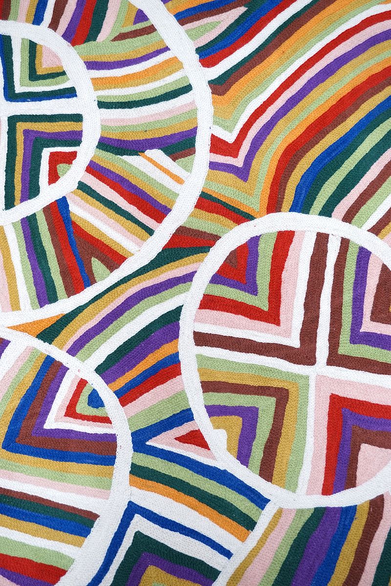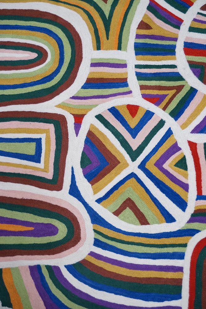 Ngayuku Ngura means My Place. Samuel uses an extensive palet of colours to paint the country surrounding Kalka and Pipalyatjara. His paintings feature the various land formations from that area - rockholes, creeks and hills. His land is a sacred mens rockhole, so sacred that the name is not allowed to be written down or spoken about.