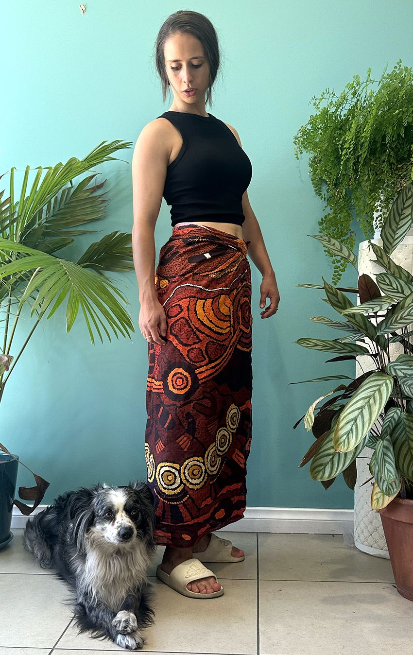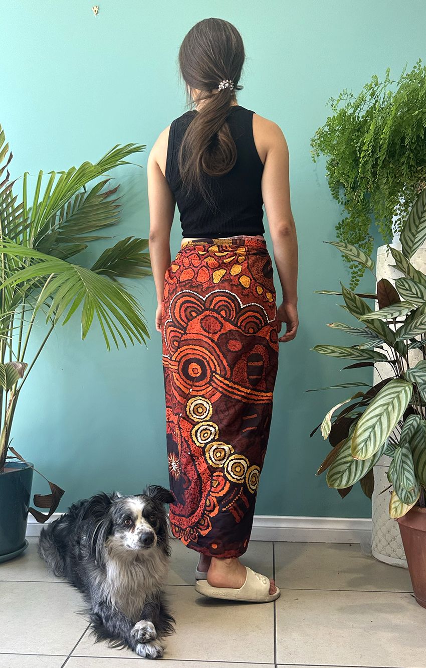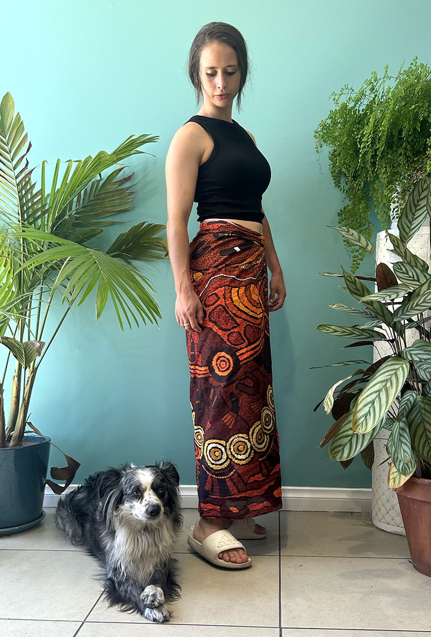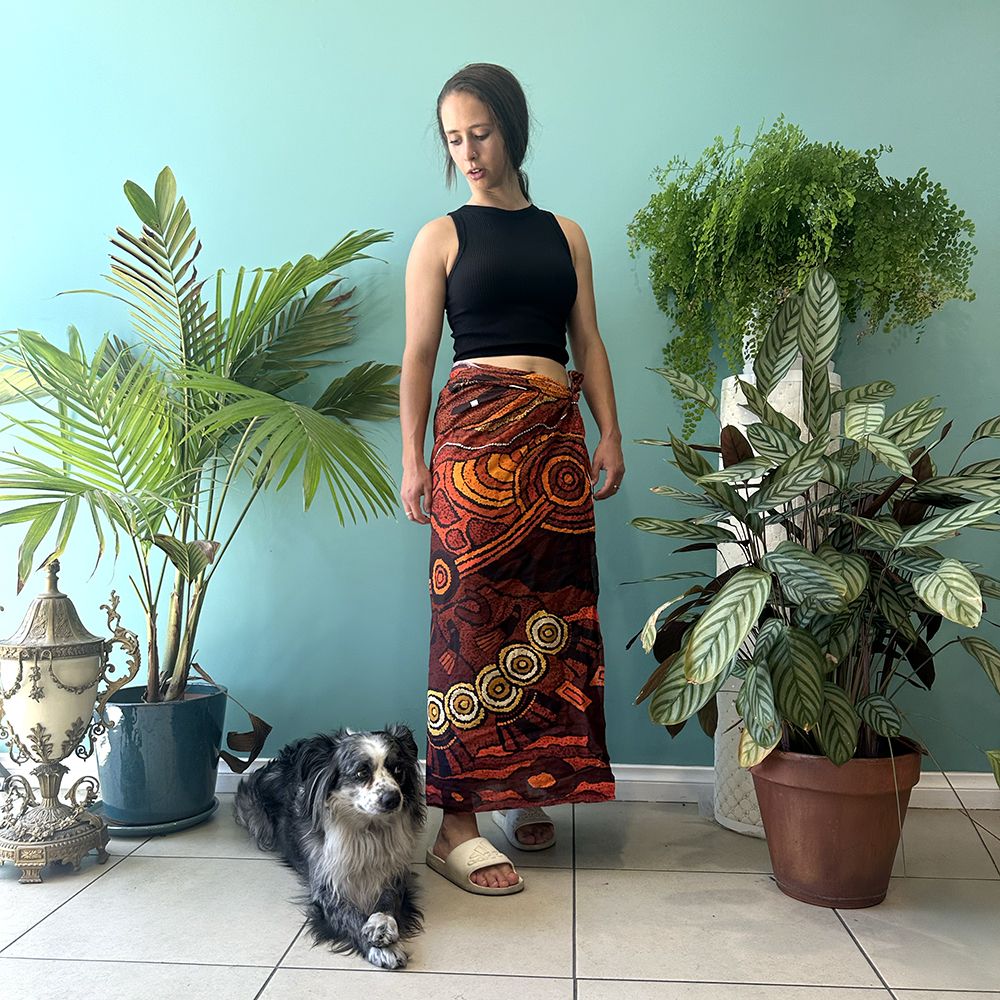 This piece tells the story of Yilpis grandfather and the hailstorm that killed him. As a young man he was stubborn and didn't listen to the elders that a big storm was coming. He went out hunting before the storm. He also wanted to perform a ceremonial dance to ward of the storm. He took the ceremonial dancing sticks, but didn't return. The rest of the clan hid in the caves to wait out the storm and afterwards, the women went searching for the man but could not find him. In another area of the country, the children were gathering bush foods and swimming in the newly filled rockholes. Quite by accident, they happened upon the body of the young man. He had died during the storm. This story is told to the children to teach them the importance of listening to their elders.