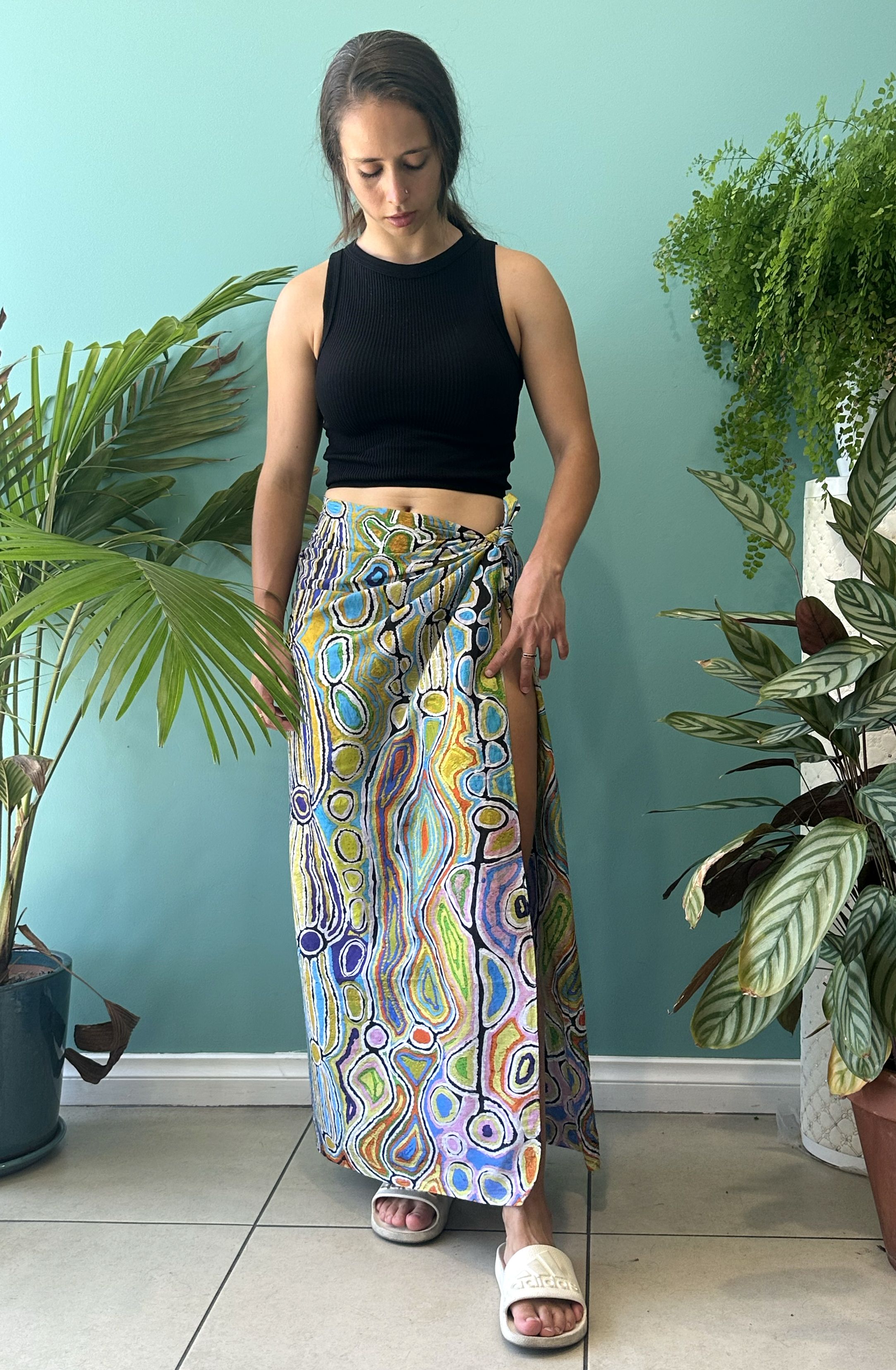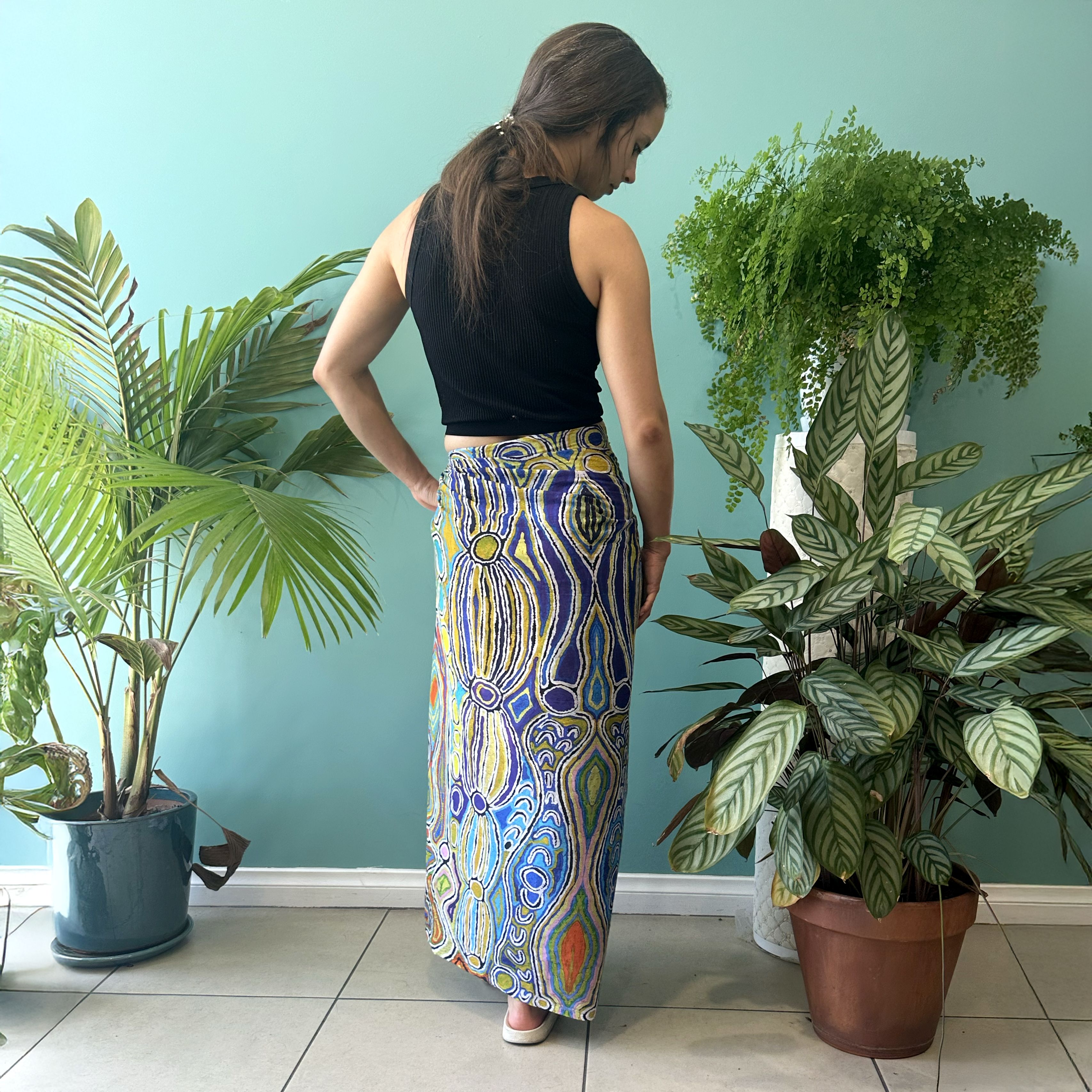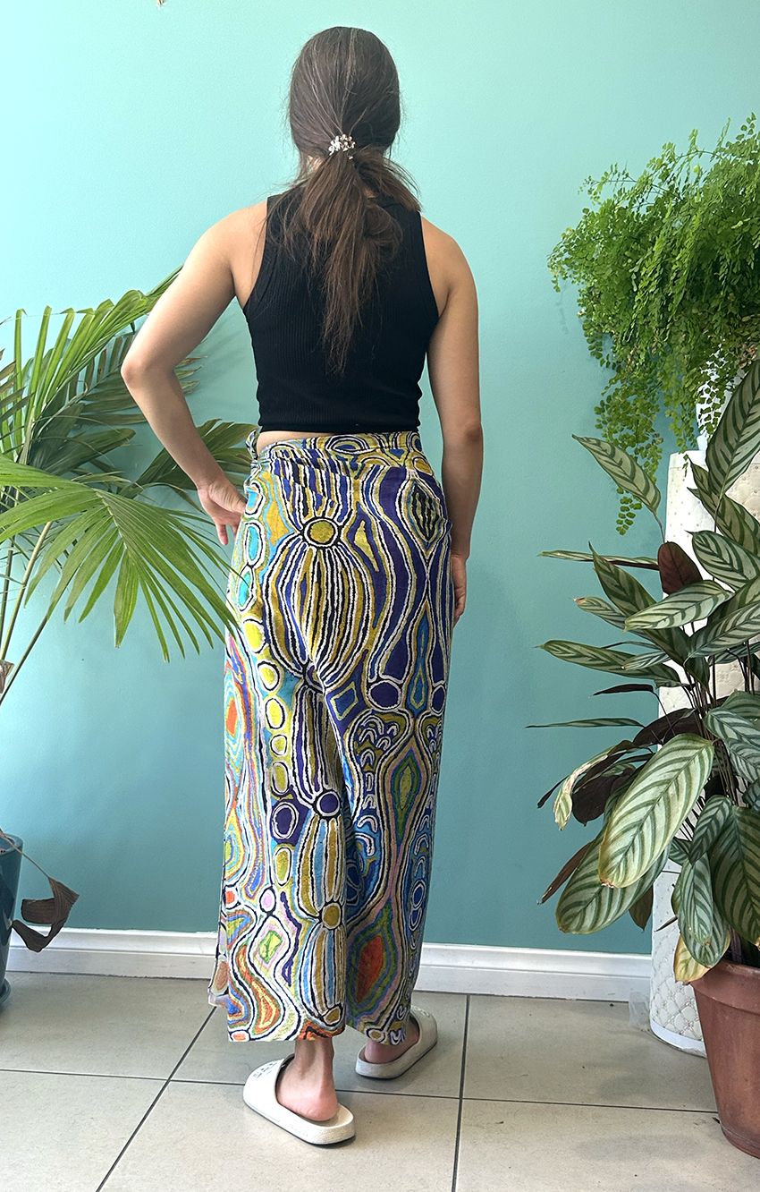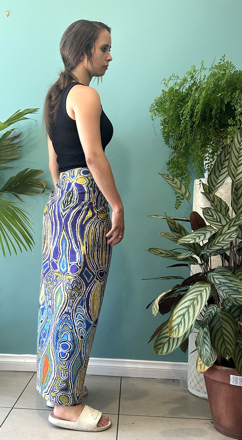 This story tells of the journey of a group of women of all ages who travelled to the east gathering food, collecting 'ngalyipi' (snake vine) and performing ceremonies as they travelled. The wavy lines represent the snake vine, the 'u' shapes the women, the circular shapes are edible mushrooms the women collect on their travels and the two straight lines in the middle represent digging sticks.