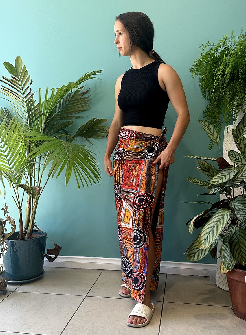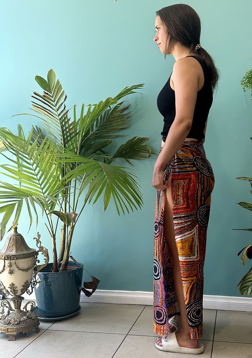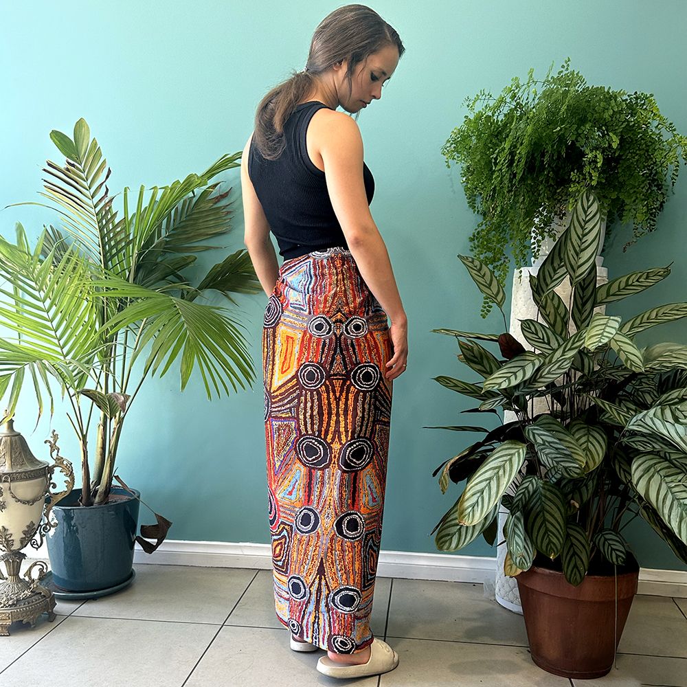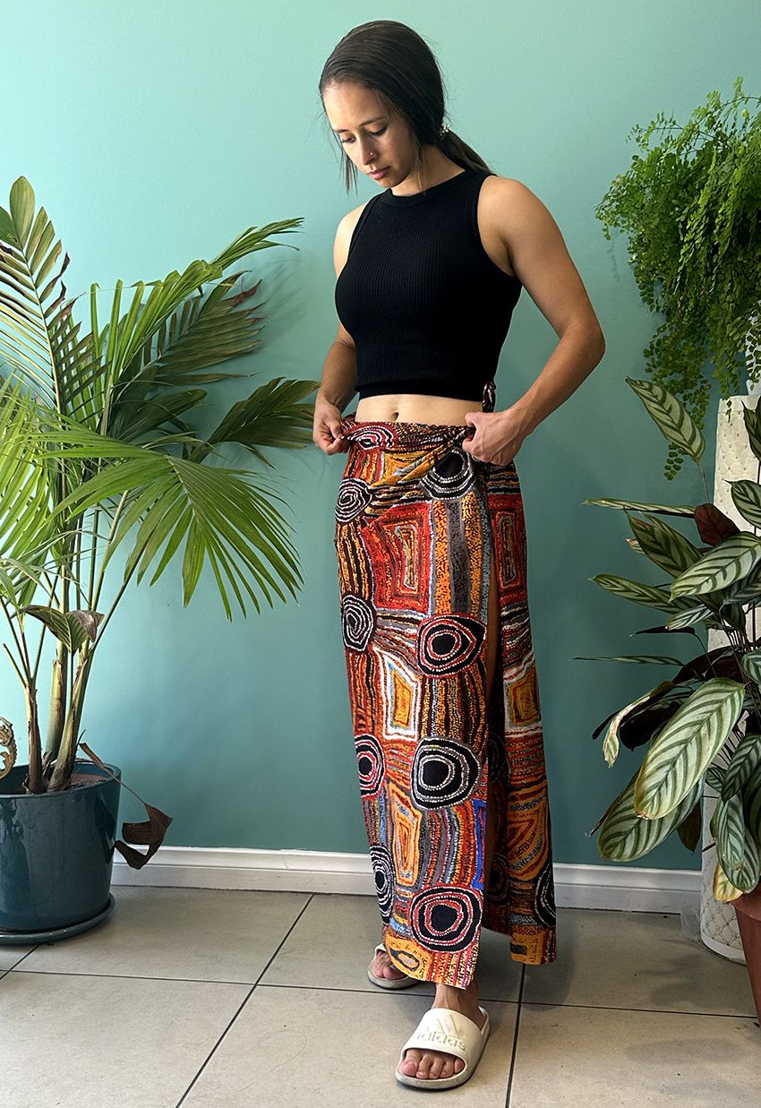 This painting depicts linear pattern 'body paint design'. The Aboriginal women paint their breasts and shoulders for ceremonies, which include song and dance used to tell their ancient stories. The concentric circles symbolise ceremonies or meeting place.