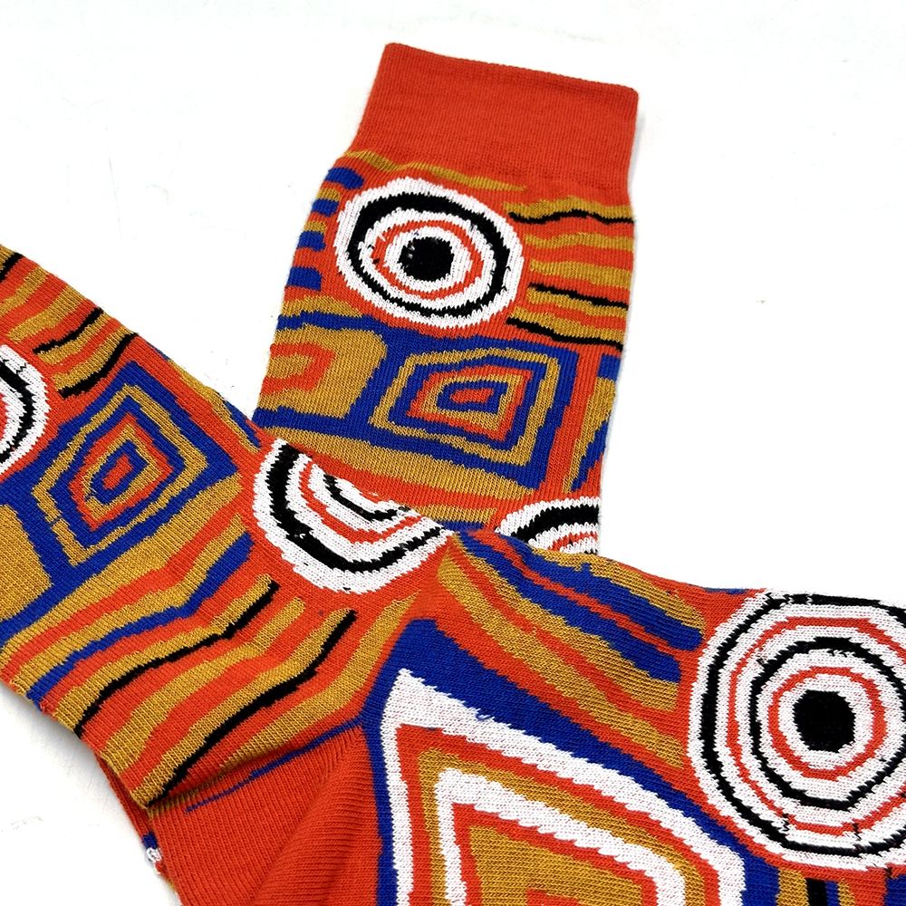 This painting depicts linear pattern 'body paint design'. The Aboriginal women paint their breasts and shoulders for ceremonies, which include song and dance used to tell their ancient stories. The concentric circles symbolise ceremonies or meeting place.