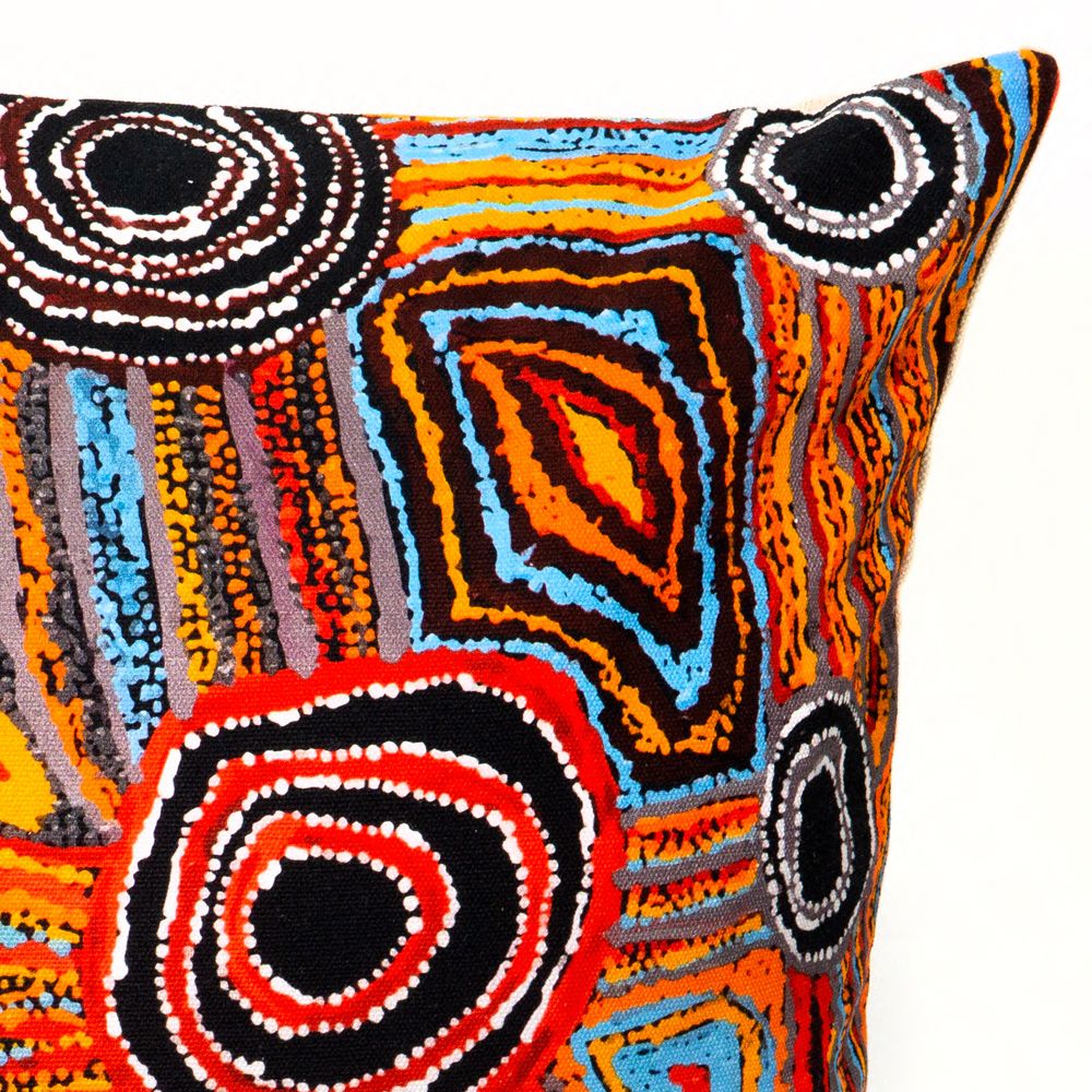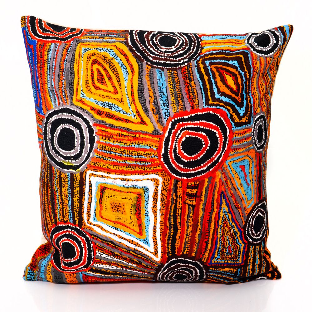 This painting depicts linear pattern 'body paint design'. The Aboriginal women paint their breasts and shoulders for ceremonies, which include song and dance used to tell their ancient stories. The concentric circles symbolise ceremonies or meeting place.
