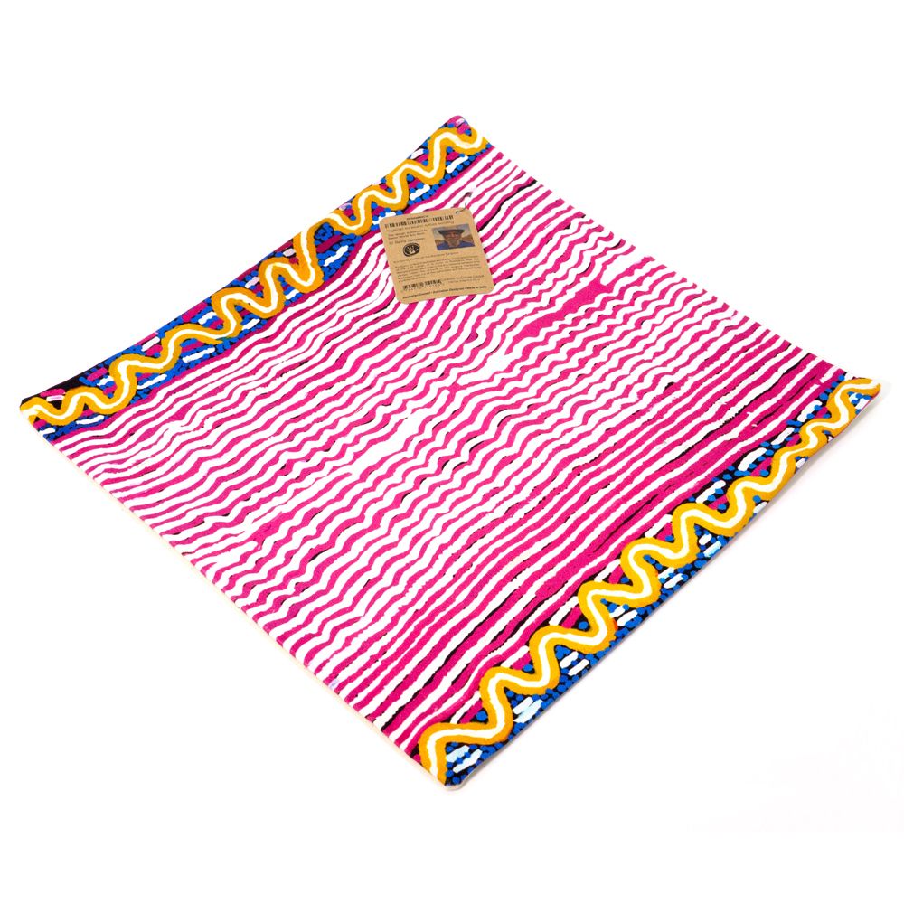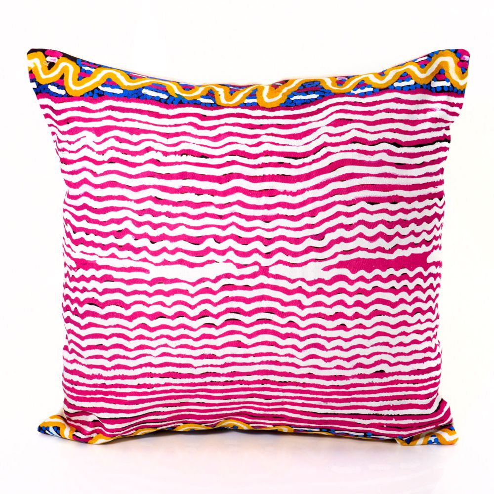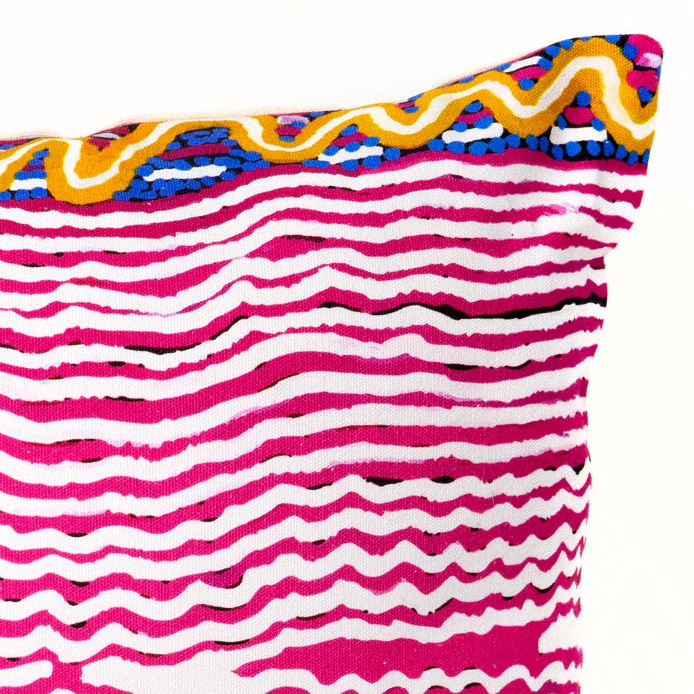 Kuntjanu is near Pipalyatjara in the far north west corner of the APY Lands. It is here, in Kuntjanu, that the Wanampi lives. Wanampi is the big rainbow serpent who sleeps under the ground in the tjukula (rockhole).This painting illustrates a part of the Wanampi Tjukurpa - Rainbow Serpent Dreaming. This is a very important Tjukurpa story, where the snakes represent men. Rama says there is one Wanampi tjilpi – old rainbow serpent man - his name is Kuntjanu. His wife is ititjara (pregnant) and is hiding under the water. There are other people there, kuniya, mingkiri, and liru. The Kuniya is a big python with a black back and yellow front. Mingkiri are the mouse people, and liru are the snake people. Liru wati pika wakanu Wanampi, Wanampi pakanu ngarangu, the snake men were angry and speared Wanampi, he rose out of the waterhole and was speared by a left handed man. Wanampi's son was born there and he still sleeps in the rockhole at Kuntjanu.