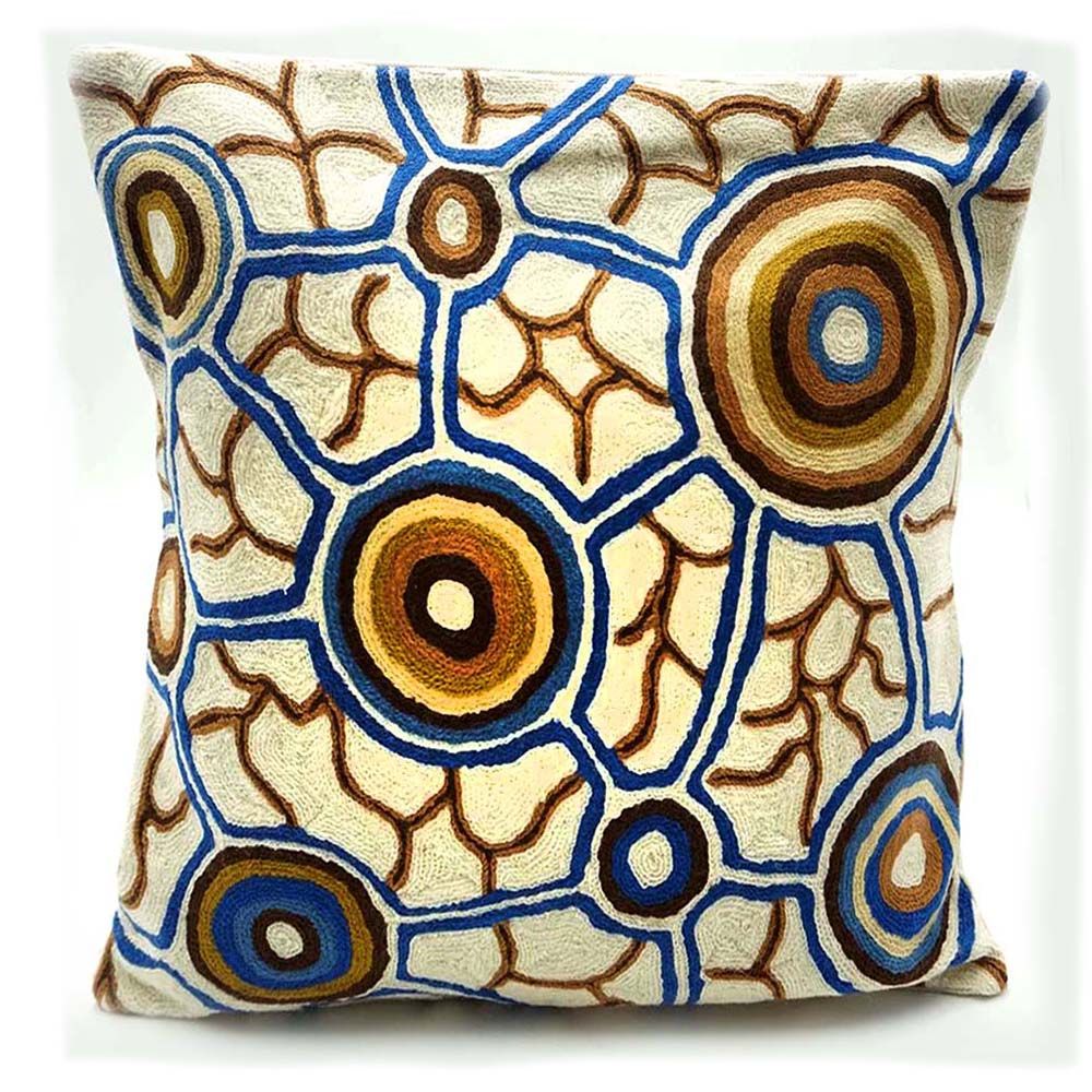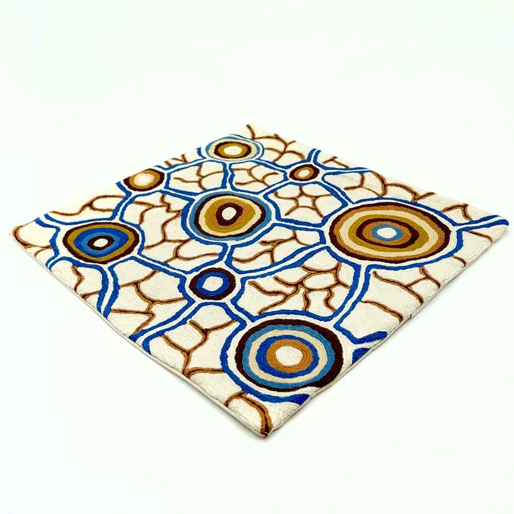 Using a gentle pallet of earth tones and blues Bianca describes the migration patterns of her ancestors that created a network of Aboriginal culture across Australia. Traditional migration patterns were age old, defined by various landmarks and natural resources. These migration patterns worked in harmony with the seasons and the natural environment.