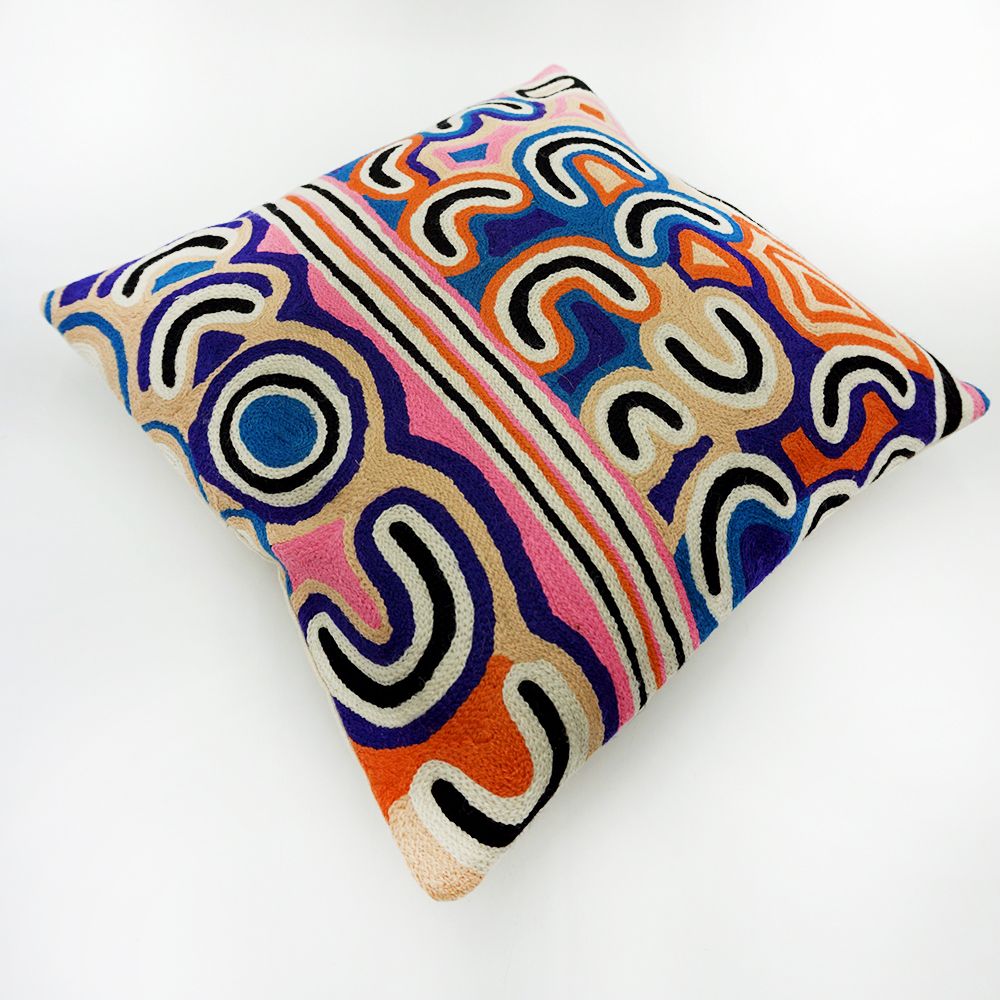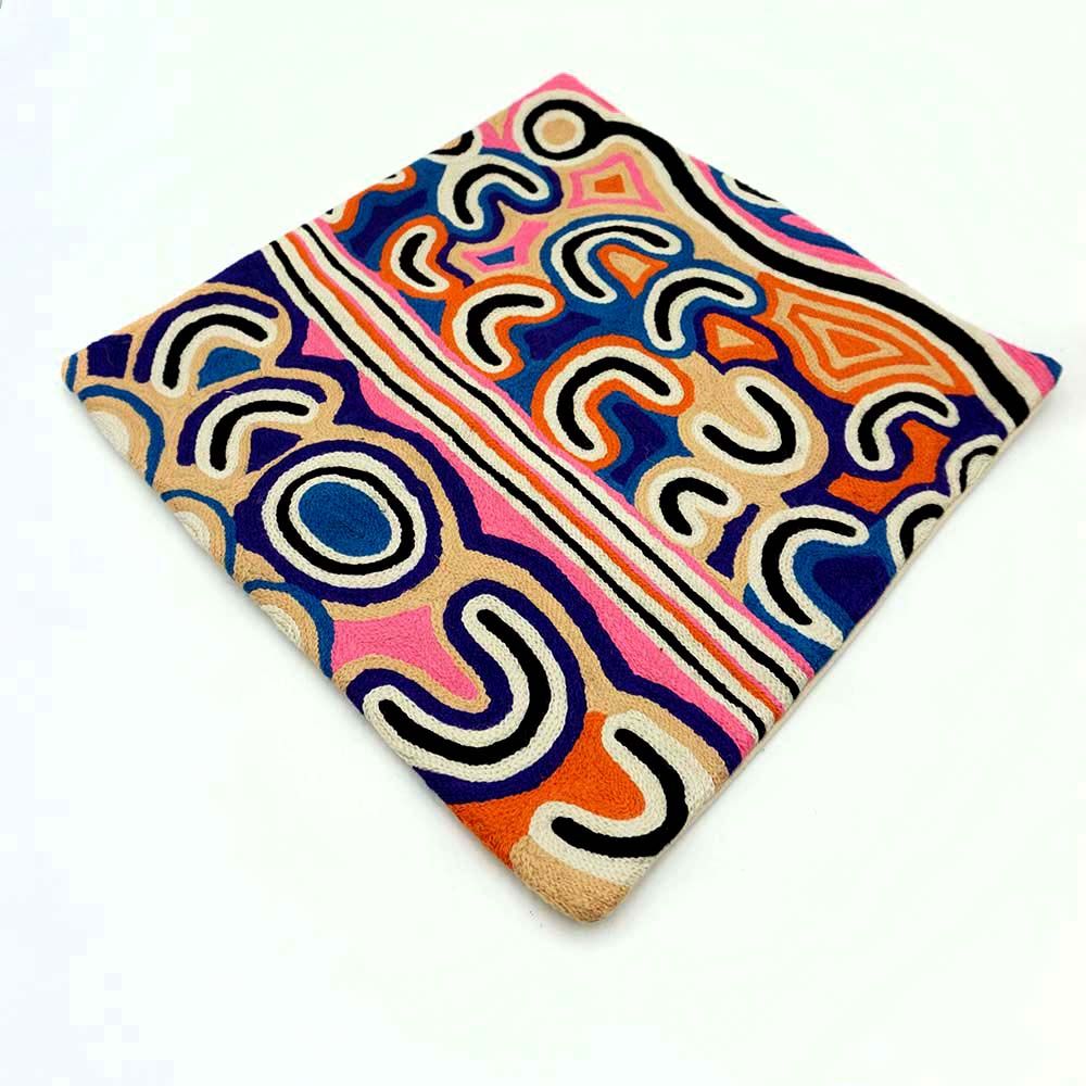 The country associated with this Jukurrpa is Mina Mina, a place far to the west of Yuendumu, which is significant to Napangardi/Napanangka women and Japangardi/Japanangka men. All of them are the custodians of the Jukurrpa that created the area. The Jukurrpa story tells of the journey of a group of women of all ages who travelled to the east gathering food, collecting ngalyipi (snake vine - Tinospora smilacina) and performing ceremonies as they travelled. The women began their journey at Mina Mina where karlangu (digging sticks) emerged from the ground. Taking these implements the women travelled east creating Janyinki and other sites. Their journey took them far to the east beyond the boundaries of Warlpiri country. The ngalyipi vine grows up the trunks and limbs of the kurrkara (desert oak - Allocasuarina decaisneana) trees. Ngalyipi is a sacred vine to Napangardi and Napanangka women that has many uses. It can be used as a ceremonial wrap, as a strap to carry parrajas (wooden bowls) that are laden with bush tucker and as a tourniquet for headaches. The wavy lines represent the snake vine, the 'u' shapes the women, the circular shapes are edible mushrooms the women collect on their travels and the two straight lines in the middle represent digging sticks.
