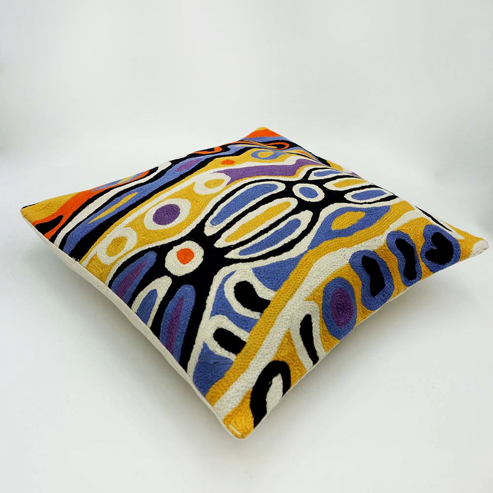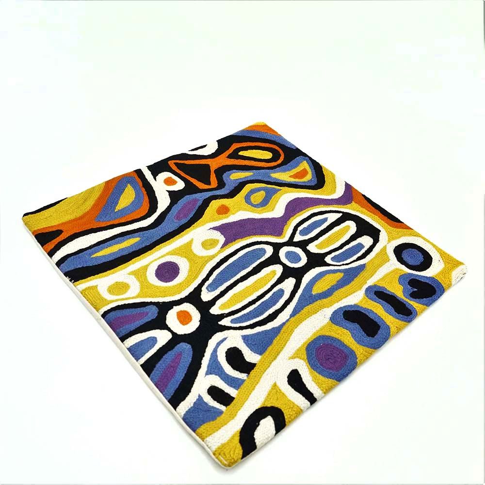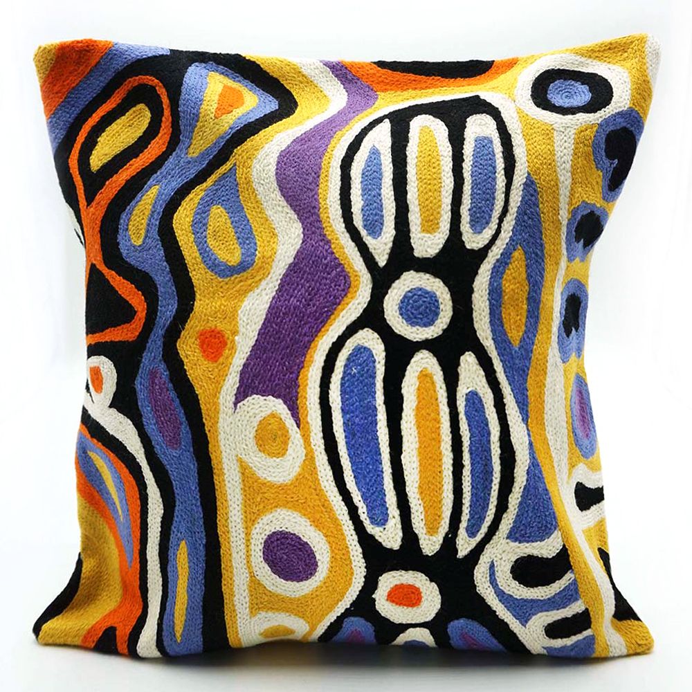 This story tells of the journey of a group of women of all ages who travelled to the east gathering food, collecting 'ngalyipi' (snake vine) and performing ceremonies as they travelled. The wavy lines represent the snake vine, the 'u' shapes the women, the circular shapes are edible mushrooms the women collect on their travels and the two straight lines in the middle represent digging sticks.