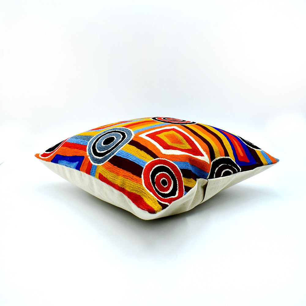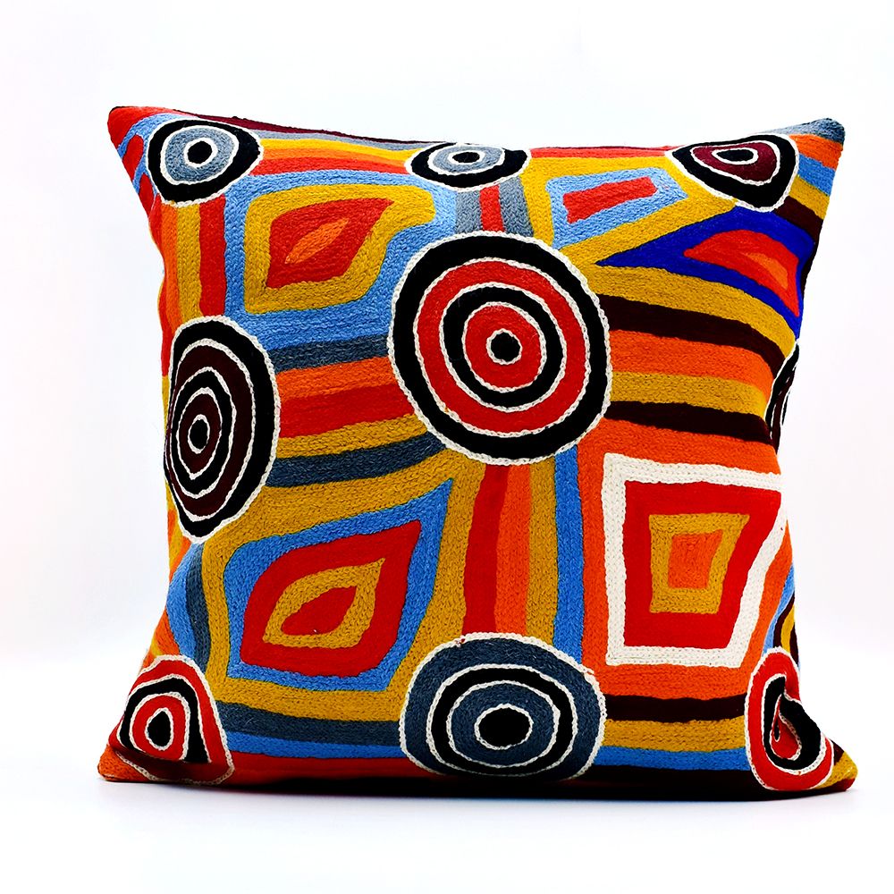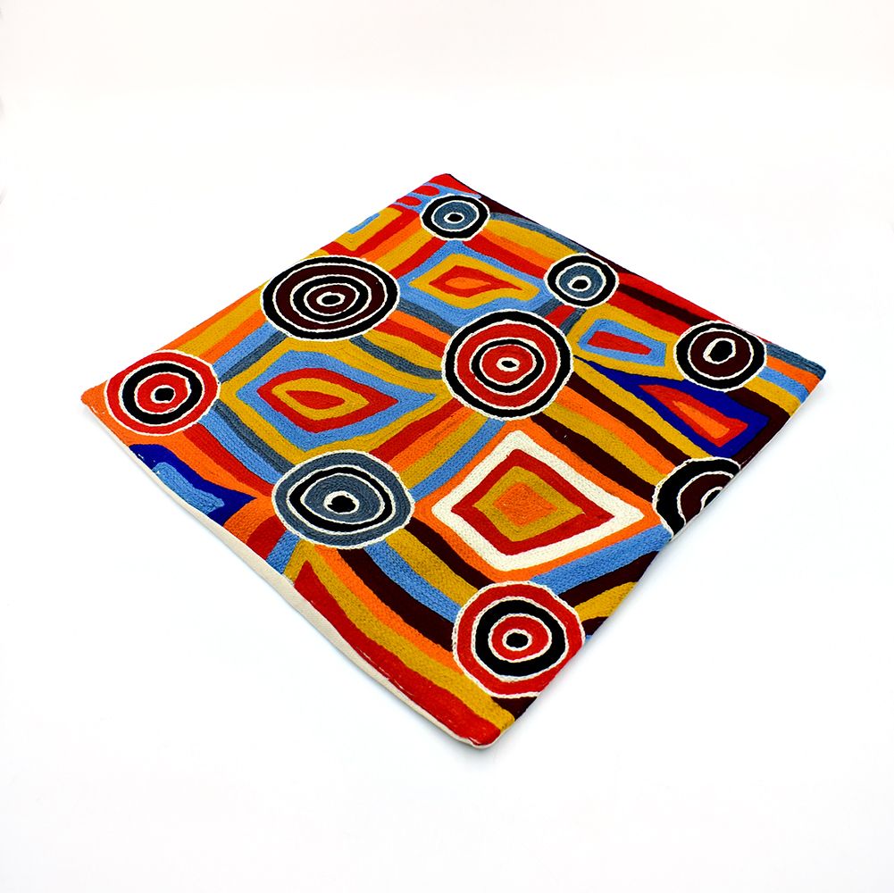 This painting depicts linear pattern 'body paint design'. The Aboriginal women paint their breasts and shoulders for ceremonies, which include song and dance used to tell their ancient stories. The concentric circles symbolise ceremonies or meeting place.
