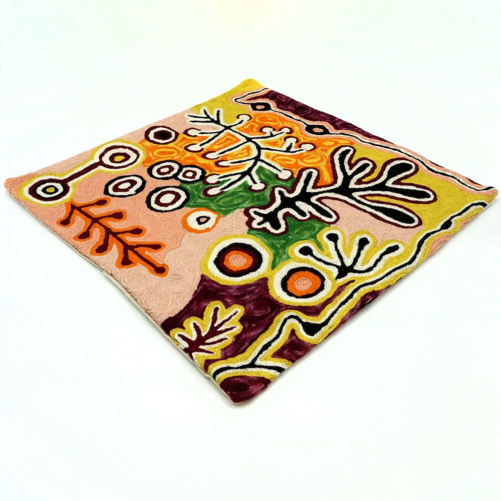 This design shows the Yam and Bush Tomato Dreaming. You can see the Yams and the small round berries of the Bush Tomatoes. In the Dreamtime the people used to eat these fruits and vegetables, just as our old people lived off them. The artist painted this painting to teach the children.