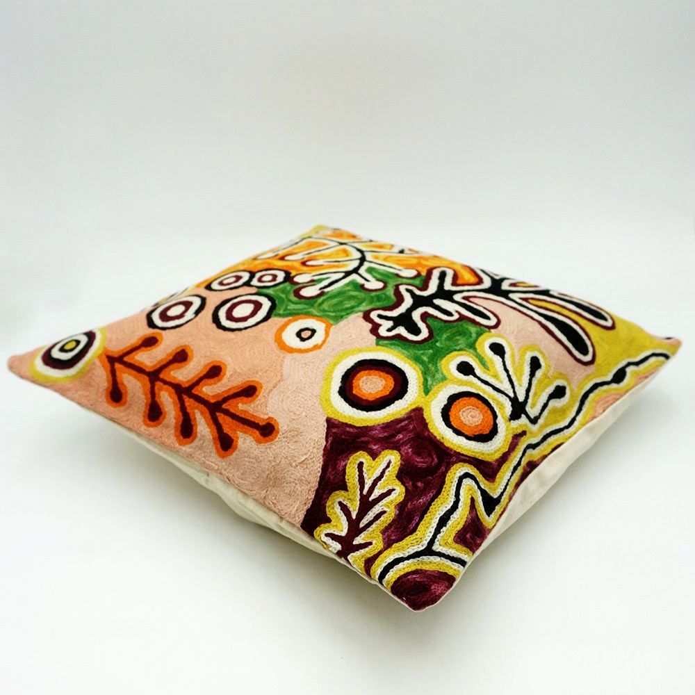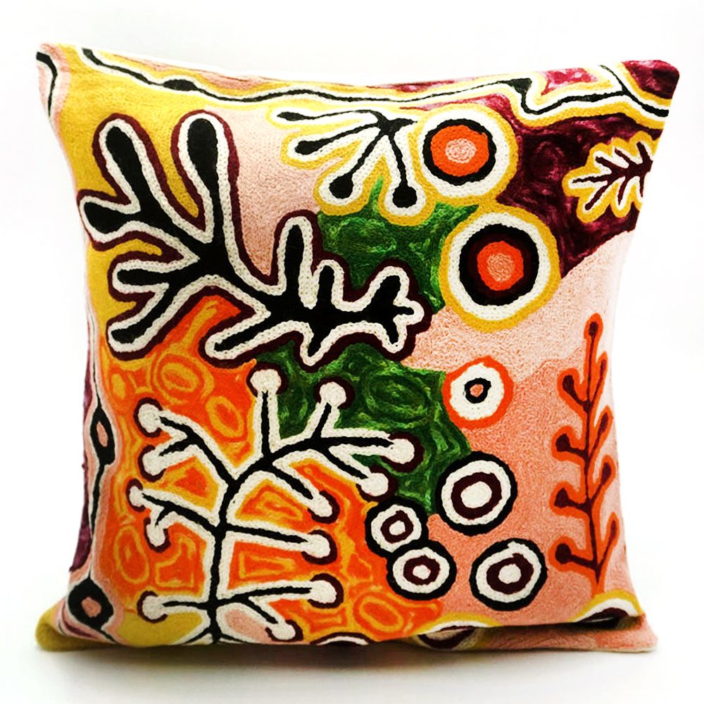 This design shows the Yam and Bush Tomato Dreaming. You can see the Yams and the small round berries of the Bush Tomatoes. In the Dreamtime the people used to eat these fruits and vegetables, just as our old people lived off them. The artist painted this painting to teach the children.