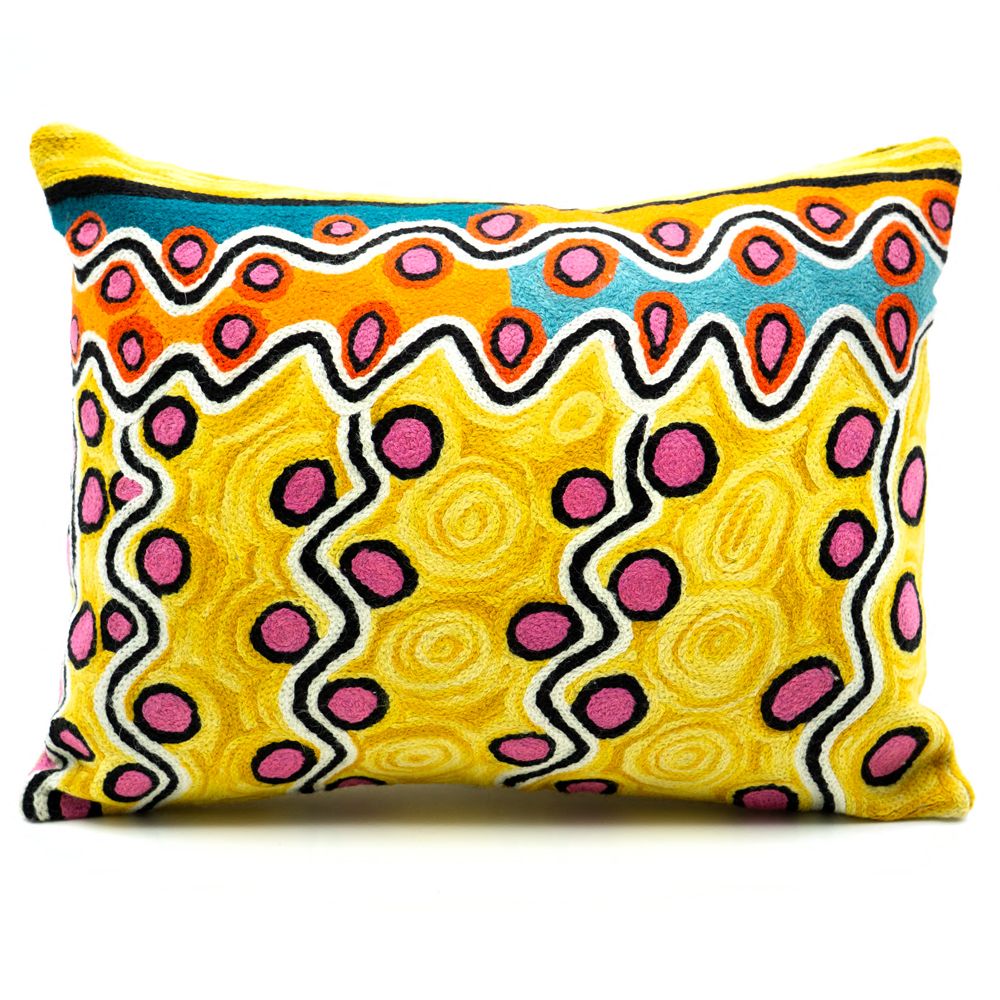 Rama’s painting illustrates the Mingkiri Tjukurpa – the dreaming of the marsupial mice near Kuntjanu, Rama's country in remote north-western South Australia. The painting shows the many burrows where the mingkiri live. The mingkiri are digging with their mulya (noses) to block their holes. When Rama talks about the Wanampi Tjukurpa (Rainbow Serpent Dreaming), he says that many stories are all together - tjungu. The Mingkiri people cry when Wanampi is speared by a left handed man, but his son was in the womb of Wanampi's wife, so the rainbow serpent still lives today at the rockhole in Kuntjanu. The kuniya (python) and liru (snake) people are also all here, in this one big story.