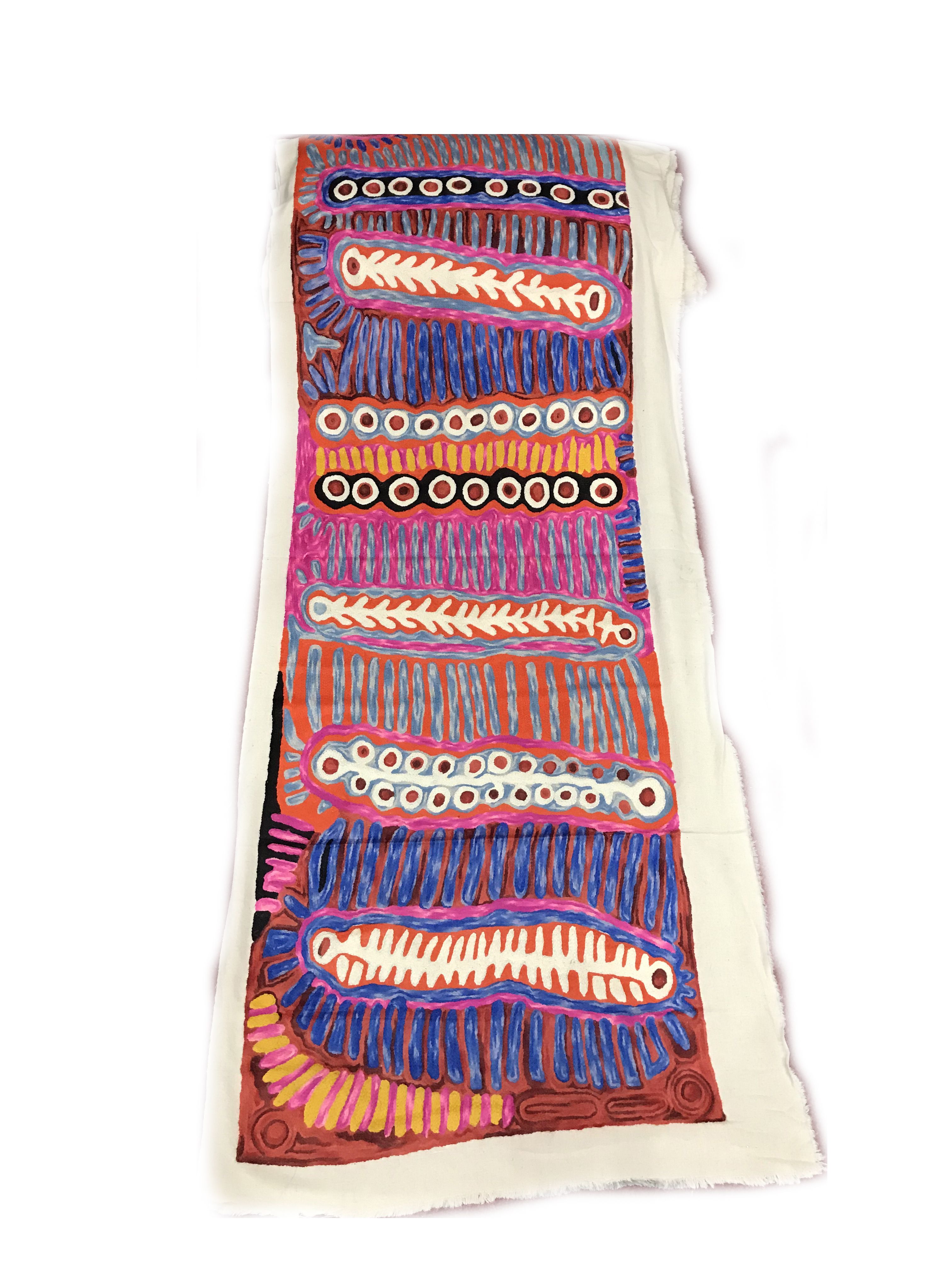In this Dreaming story, two dog ancestors, a Jampijinpa and a Napangardi, travelled from the west to the east. At Tapu (a rockhole), the two dogs separated. The female dog, Napangardi, went to the south. The male dog, Jampijinpa, went to the north. Eventually he became lonely and howled for Napangardi in the south. She came running to him, and they married each other at Ngarnka. They wore men’s and women’s marriage headdresses, and Jampijinpa painted himself with white clay for the ceremony. The two dogs continued running east, before arriving in Warlaku (Ali Curung). Many other dogs were living in Warlaku when they arrived. There were many families of dogs, mothers and fathers and children and uncles all living together. Jampijinpa and Napangardi made a burrow to rest in and started a big family of dogs there. They chose to stay in Warlaku and live with all the other dogs. In this way, the ‘malikijarra Jukurrpa’ (two dogs Dreaming) tells the story of proper conduct in families and marriages.