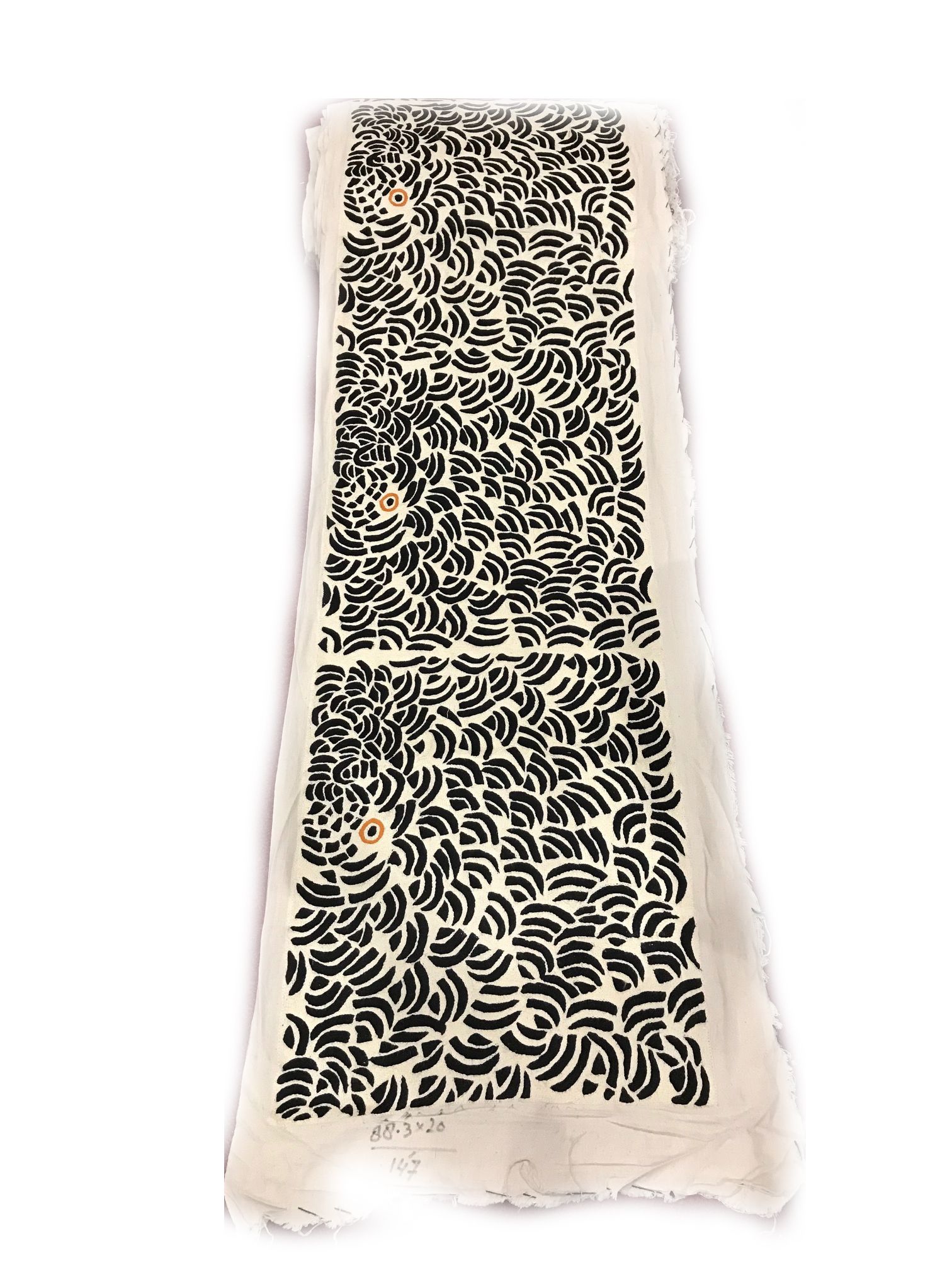 This is a very important woman's story for Nelly. Its a story about the strong woman's culture. Nelly sings the story while she is painting. Nelly is worried for her peoples culture and special ceremonial songs. Nelly tells the story like this.There are many women sitting together, young old and middle age women. All the elders begin singing together and the middle age people join in, singing and dancing. The women begin having a big ceremony. It is very important ceremony for all these women. The elders tell the middle age women not to tell the young people the sacred songs because they are not keeping them secret and safe. The orange circle symbolises a nulla nulla which is special tool also used for dancing.