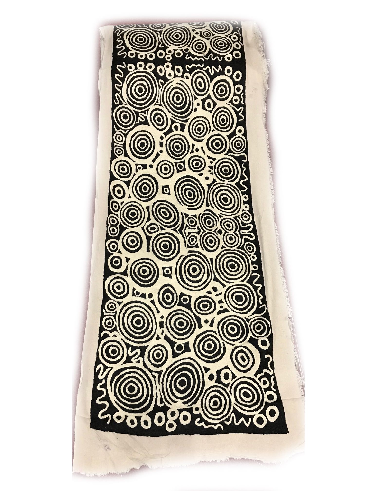 Nelly has an intimate knowledge of the Seven Sisters Storyan epic Tjukurpa (creation) story in which a man, Wati Nyiru chases seven sisters across the whole of Australia.The sisters started in Whyalla. Wati Nyiru chased them down to Port Augusta and wouldnt leave the sisters alone. He wanted to marry the big sister. The sisters left in the middle of the night to try and get away from him while he was sleeping. When Wati Nyiru woke, he wondered where the sisters had gone, but he soon was on their trail again, and found them near Canberra. The eldest sister was worried - she knew he was there again, watching the sisters while they camped. Nelly explains that Wati Nyiru was a mad one, he knew they were scared, but he still followed them. Wati Nyiru got very close to the sisters. The eldest sister was secretly signalling to the sisters that he was nearby, so as to not let Wati Nyiru know she was aware he was there.The man, Wati Nyiru, was singing about how much he wanted the big sister. He did too much dancing, that man, and the sisters ran away. He loved all the girls.The girls kept running. This painting depicts some of the places where the sisters camped.