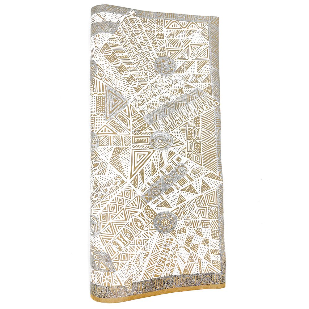 Simplicia paints a story about an old lady who travelled around with her six kids looking for food and water. When the old lady couldnt find anything, she started making a hole and then the water came out. Lots of different animals came to the waterhole. The old lady made four islands like Darwin, Bathurst and here (Melville Island). She made the waters and all the sea animals like crabs, barramundis, mud mussels, longbums, stingrays, turtles, dugongs, fishes that were good for food. Then she made the islands. The old lady travelled with her kids on her back, making the islands. Old and young people came and they were making a fire and dancing around it. They were happy for all the water everywhere.