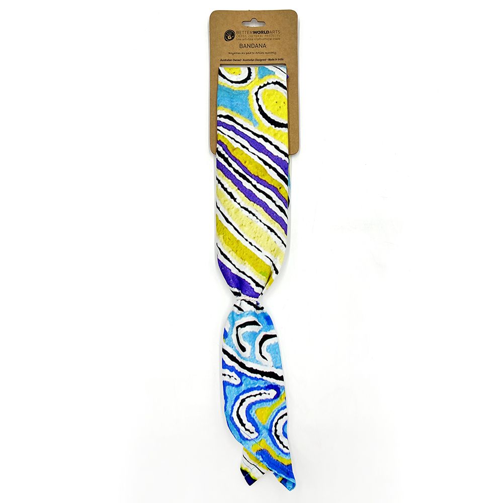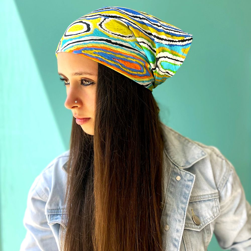 This story tells of the journey of a group of women of all ages who travelled to the east gathering food, collecting 'ngalyipi' (snake vine) and performing ceremonies as they travelled. The wavy lines represent the snake vine, the 'u' shapes the women, the circular shapes are edible mushrooms the women collect on their travels and the two straight lines in the middle represent digging sticks.