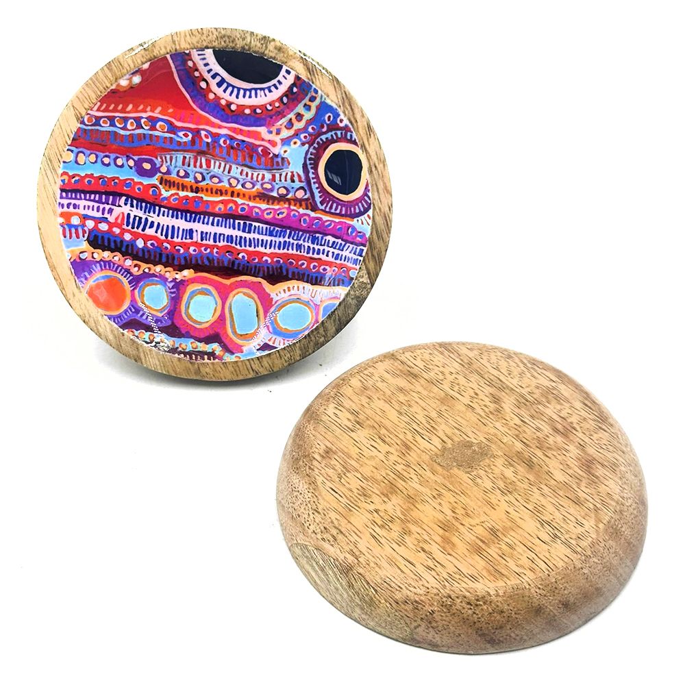 Two dog ancestors, a Jampijinpa and a Napangardi, travelled from the west to the east. They dug holes in the ground and created ‘warnirri’ (rockholes) and ‘ngapa’ (waterholes) as they went. The two dogs separated. Eventually Jampijinpa became lonely and howled for Napangardi in the south. She came running to him, and they married each other at Ngarnka.