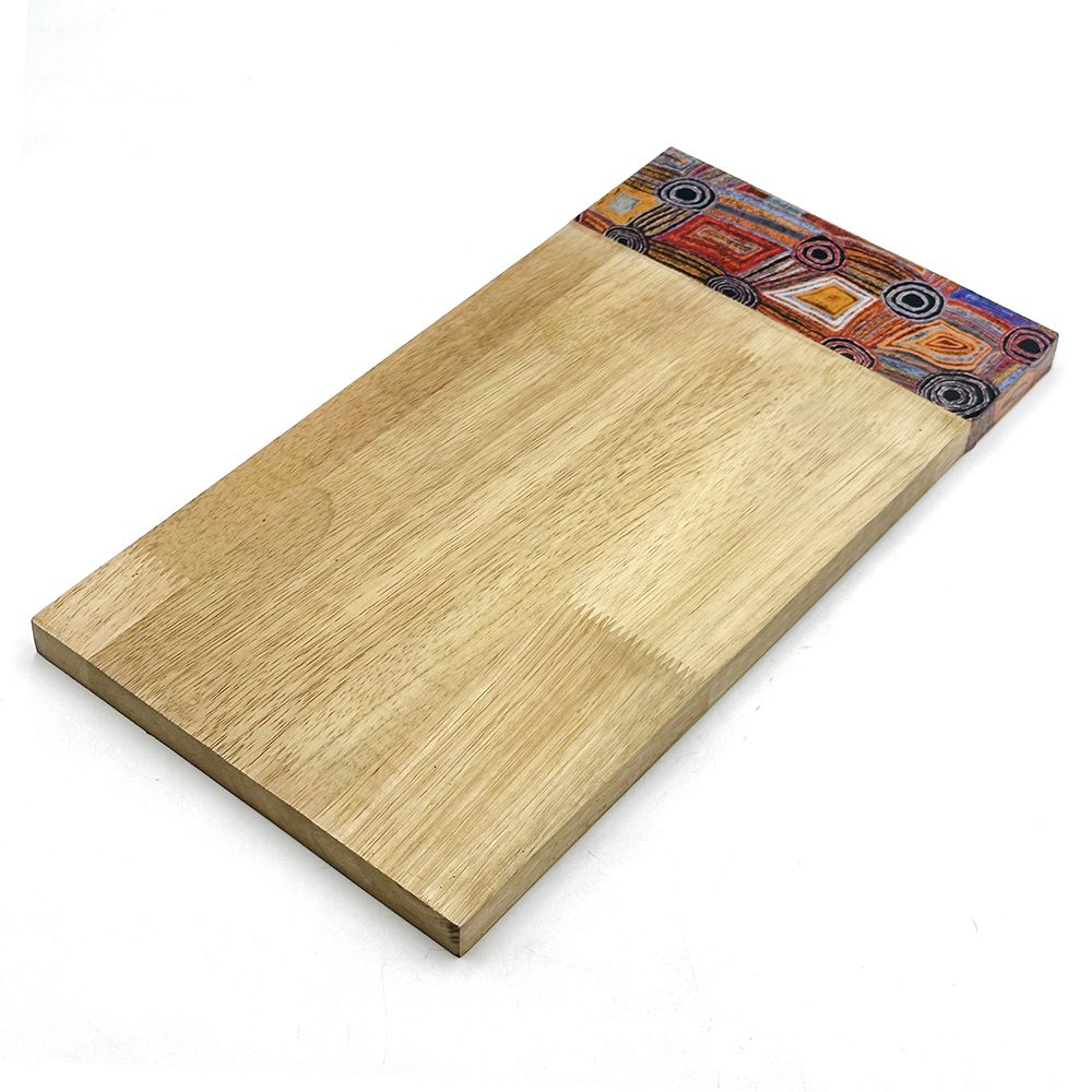 This painting depicts linear pattern 'body paint design'. The Aboriginal women paint their breasts and shoulders for ceremonies, which include song and dance used to tell their ancient stories. The concentric circles symbolise ceremonies or meeting place.