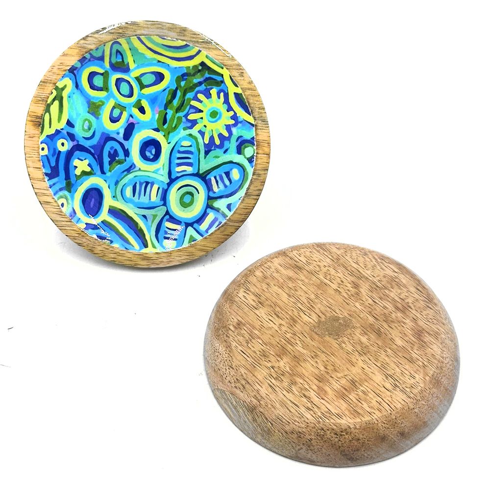 When Ngurunderi travelled through what is now Ngarrindjeri country he came down the Murray River in his canoe. At that time it was just a small stream. Ngurunderi was looking for his two wives who had run away from him and was following Pondi, the big Murray Cod who had created the twists and turns of the river when sweeping his huge tail from side to side. Ngurunderi was trying to spear Pondi all the way along the journey.Together they formed the Murray River, lakes and landforms and everything in Ngarrindjeri Country. Ngurunderi made the rain that feeds the river and the country. With the rain came the rainbow, which can be seen in this painting. Ngurunderi also made the Ngarrindjeri people, who live along and around the River Murray, lakes, the Coorong region and across to Cape Jervis and the southern regions of what is now Adelaide. Ngurunderi travelled with his family and they also played a part in the creation of Ngarrindjeri country. Ngurunderi taught everyone the lore, dance, song, how to hunt and live and everything they needed to survive in their country. When they reached Lake Alexandrina Nepele, Ngurunderi�s brother in law, helped spear and kill Pondi. Ngurunderi cut Pondi into many pieces, each piece creating a new species of fish that now populates the river system. Ngurunderi never did catch his wives who drowned when crossing to Kangaroo Island, which was still joined to the mainland at that time. At this point Ngurunderi joined the spirit world becoming a star in the Milky Way. In July 2015 Cedric was given a grant by Arts SA. for professional development and cultural research. With the support of Better World Arts, Cedric pursued an intensive program of studying archived information at the South Australian Museum. He spent time talking to Ngarrindjeri elders and researching his Ngarrindjeri heritage in some depth. During the same time period Cedric undertook some developmental workshops focused on his painting. These workshops provided life drawing, brush techniques and colour theory components, providing tools and knowledge for Cedric to include in the technical sides of his art. The results of these inputs into Cedric�s artistic and cultural development were immediately evident. Cedric continues to develop as an artist.