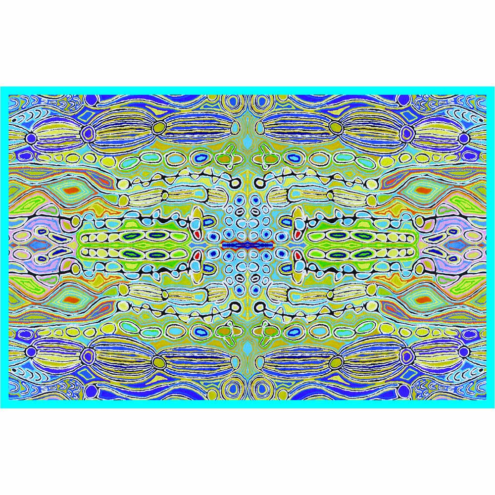 This story tells of the journey of a group of women of all ages who travelled to the east gathering food, collecting 'ngalyipi' (snake vine) and performing ceremonies as they travelled. The wavy lines represent the snake vine, the 'u' shapes the women, the circular shapes are edible mushrooms the women collect on their travels and the two straight lines in the middle represent digging sticks.