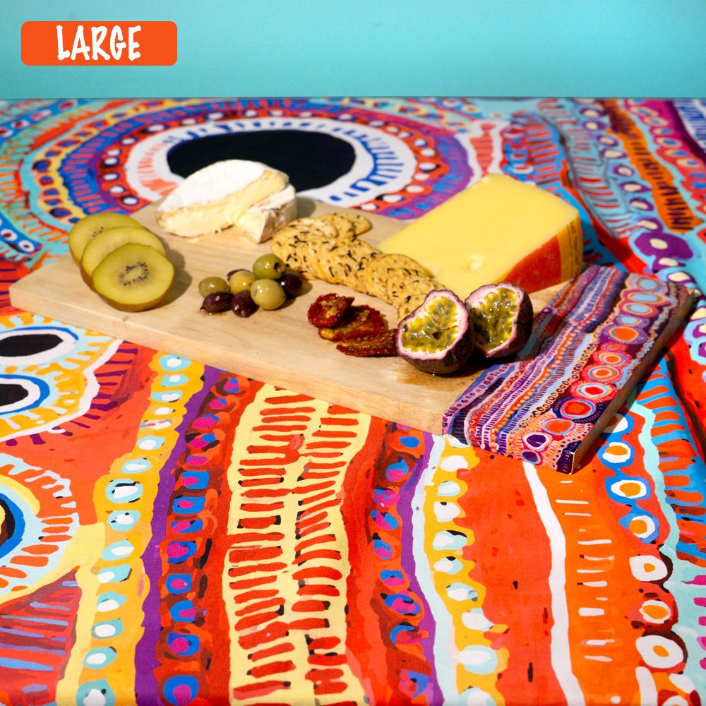 Two dog ancestors, a Jampijinpa and a Napangardi, travelled from the west to the east. They dug holes in the ground and created ‘warnirri’ (rockholes) and ‘ngapa’ (waterholes) as they went. The two dogs separated. Eventually Jampijinpa became lonely and howled for Napangardi in the south. She came running to him, and they married each other at Ngarnka.