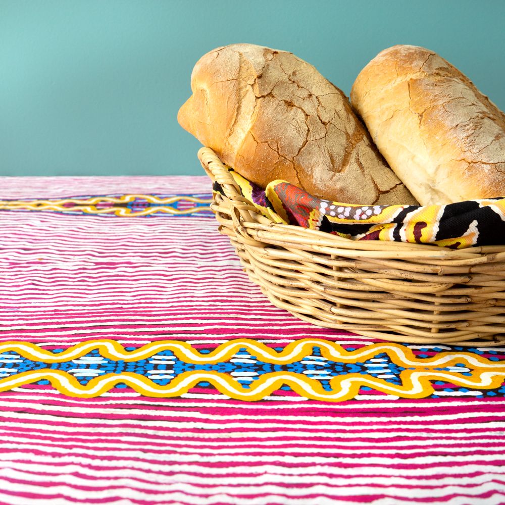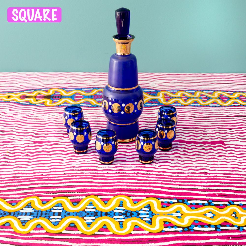 Kuntjanu is near Pipalyatjara in the far north west corner of the APY Lands. It is here, in Kuntjanu, that the Wanampi lives. Wanampi is the big rainbow serpent who sleeps under the ground in the tjukula (rockhole).This painting illustrates a part of the Wanampi Tjukurpa - Rainbow Serpent Dreaming. This is a very important Tjukurpa story, where the snakes represent men. Rama says there is one Wanampi tjilpi – old rainbow serpent man - his name is Kuntjanu. His wife is ititjara (pregnant) and is hiding under the water. There are other people there, kuniya, mingkiri, and liru. The Kuniya is a big python with a black back and yellow front. Mingkiri are the mouse people, and liru are the snake people. Liru wati pika wakanu Wanampi, Wanampi pakanu ngarangu, the snake men were angry and speared Wanampi, he rose out of the waterhole and was speared by a left handed man. Wanampi's son was born there and he still sleeps in the rockhole at Kuntjanu.