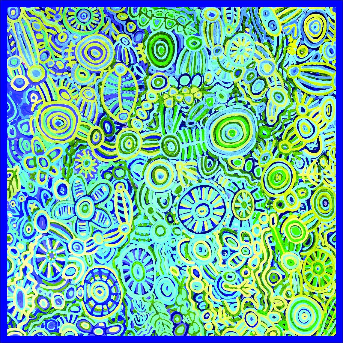 When Ngurunderi travelled through what is now Ngarrindjeri country he came down the Murray River in his canoe. At that time it was just a small stream. Ngurunderi was looking for his two wives who had run away from him and was following Pondi, the big Murray Cod who had created the twists and turns of the river when sweeping his huge tail from side to side. Ngurunderi was trying to spear Pondi all the way along the journey. Together they formed the Murray River, lakes and landforms and everything in Ngarrindjeri Country. Ngurunderi made the rain that feeds the river and the country. With the rain came the rainbow, which can be seen in this painting. Ngurunderi also made the Ngarrindjeri people, who live along and around the River Murray, lakes, the Coorong region and across to Cape Jervis and the southern regions of what is now Adelaide. Ngurunderi travelled with his family and they also played a part in the creation of Ngarrindjeri country. Ngurunderi taught everyone the lore, dance, song, how to hunt and live and everything they needed to survive in their country. When they reached Lake Alexandrina Nepele, Ngurunderi’s brother in law, helped spear and kill Pondi. Ngurunderi cut Pondi into many pieces, each piece creating a new species of fish that now populates the river system. Ngurunderi never did catch his wives who drowned when crossing to Kangaroo Island, which was still joined to the mainland at that time. At this point Ngurunderi joined the spirit world becoming a star in the Milky Way. In July 2015 Cedric was given a grant by Arts SA. for professional development and cultural research. With the support of Better World Arts, Cedric pursued an intensive program of studying archived information at the South Australian Museum. He spent time talking to Ngarrindjeri elders and researching his Ngarrindjeri heritage in some depth. During the same time period Cedric undertook some developmental workshops focused on his painting. These workshops provided life drawing, brush techniques and colour theory components, providing tools and knowledge for Cedric to include in the technical sides of his art. The results of these inputs into Cedric’s artistic and cultural development were immediately evident. Cedric continues to develop as an artist.