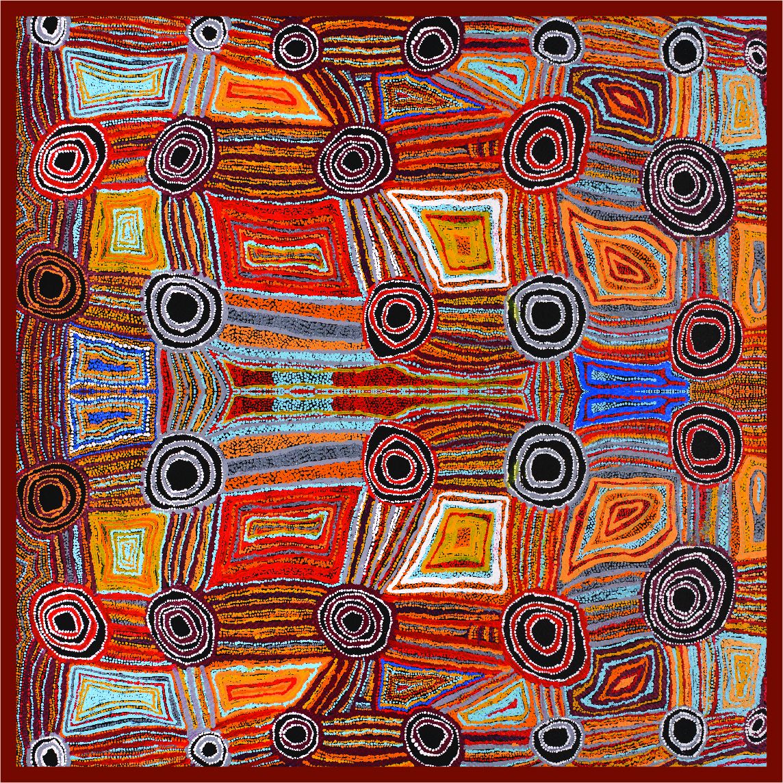This painting depicts linear pattern 'body paint design'. The Aboriginal women paint their breasts and shoulders for ceremonies, which include song and dance used to tell their ancient stories. The concentric circles symbolise ceremonies or meeting place.