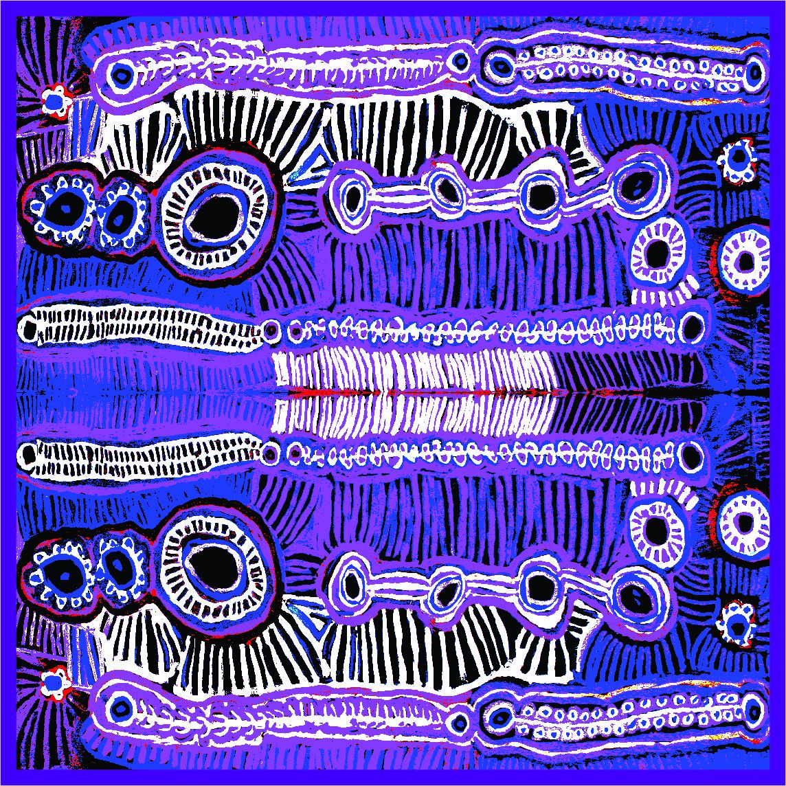 In this Dreaming story, two dog ancestors, a Jampijinpa and a Napangardi, travelled from the west to the east. At Tapu (a rockhole), the two dogs separated. The female dog, Napangardi, went to the south. The male dog, Jampijinpa, went to the north. Eventually he became lonely and howled for Napangardi in the south. She came running to him, and they married each other at Ngarnka. They wore men’s and women’s marriage headdresses, and Jampijinpa painted himself with white clay for the ceremony. The two dogs continued running east, before arriving in Warlaku (Ali Curung). Many other dogs were living in Warlaku when they arrived. There were many families of dogs, mothers and fathers and children and uncles all living together. Jampijinpa and Napangardi made a burrow to rest in and started a big family of dogs there. They chose to stay in Warlaku and live with all the other dogs. In this way, the ‘malikijarra Jukurrpa’ (two dogs Dreaming) tells the story of proper conduct in families and marriages.