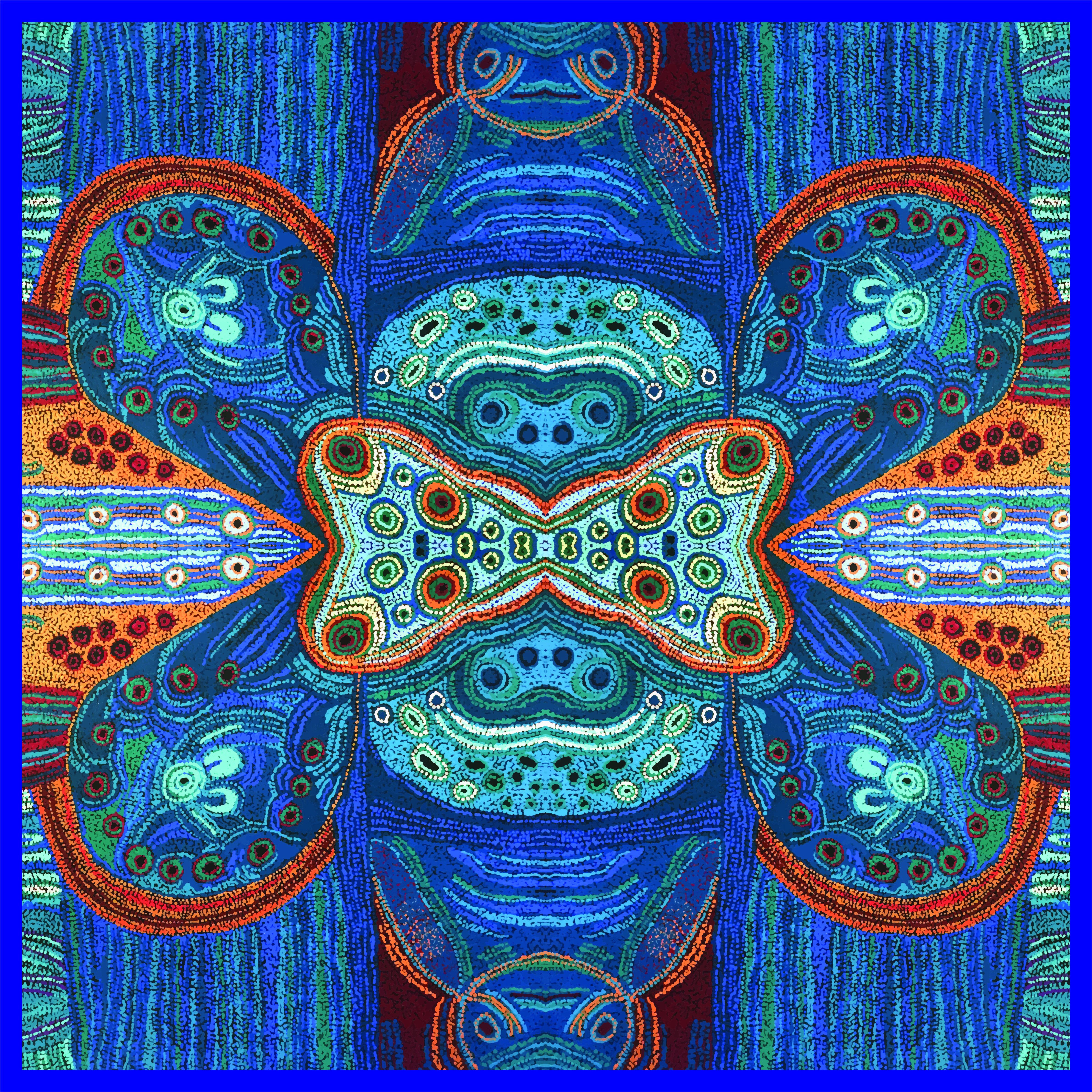 Julie is telling the story of two sisters travelling through her mother's country towards Docker River, Northern Territory. They stopped at Ilkuwaratjara and cut a wana (digging stick). The punu (wood) was really straight. The little sister was getting homesick, but the big sister said; "No, I am taking you to meet your family." Along the way they were digging for kuka (meat such as goanna) and Niny (Bilby). They got kuka and they were happy to have a good feed. The 'U' shapes are the sisters. Next to them are their wana or digging sick. The circles represent rock or water holes where water collects after the rains.