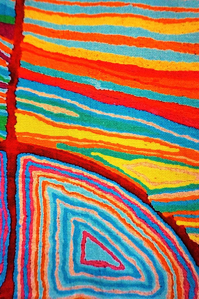 Mina Mina, a place far west of Yuendumu, significant to Napangardi and Napanangka women who are the custodians of the Dreaming that created the area. It describes the journey of a group of women of all ages who travelled east gathering food.