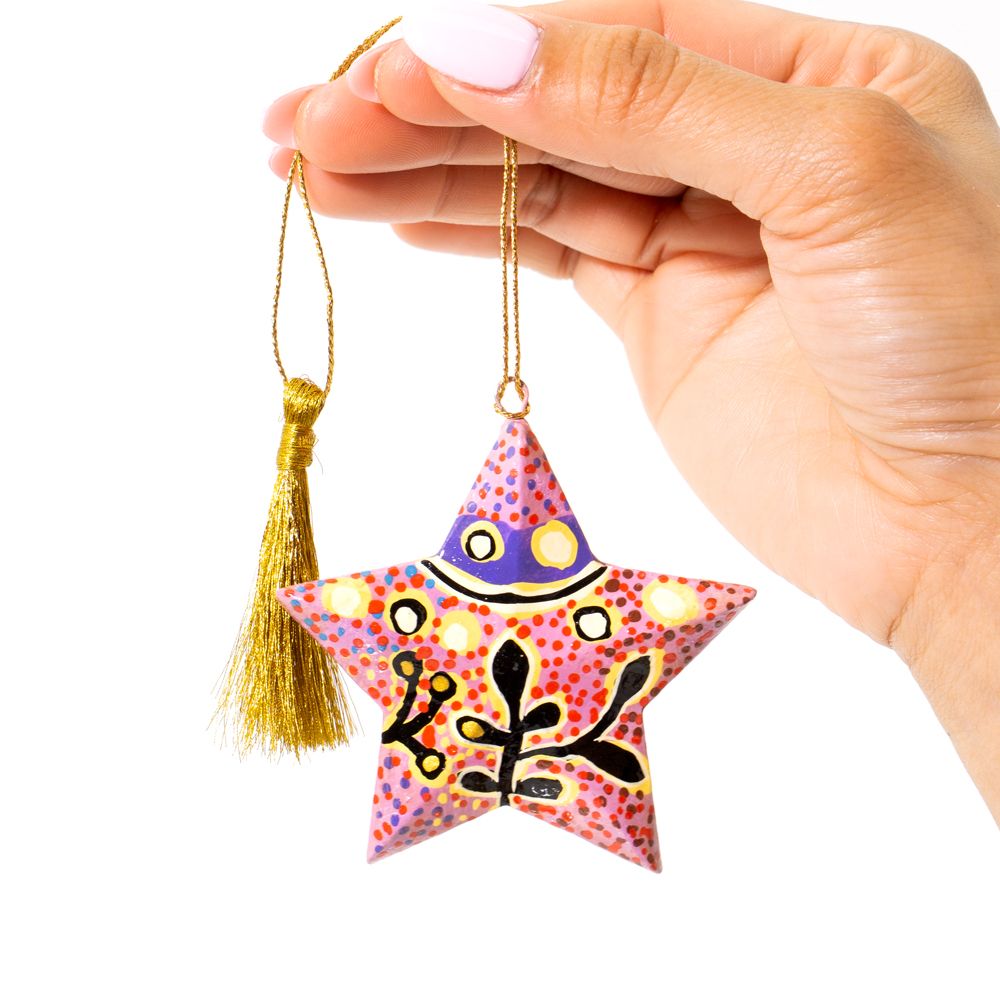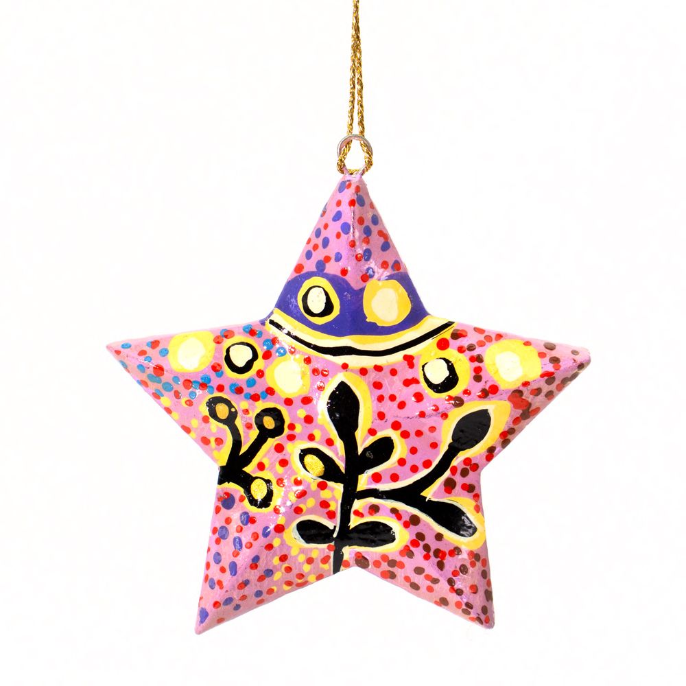 Pretty hand modelled hearts hung on black cotton cord and hand painted by Kashmiri artisans. Licensed Aboriginal artworks form the basis of the designs that are reproduced onto the heart, generating royalties for the artists and sustainable income for Kashmiri artisans living in remote rural regions.