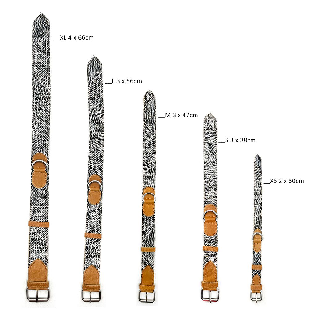 Medium - 35 to 47cm - 3cm. Note length measured at the last hole. Suede lined printed canvas dog collar, quality steel fittings.