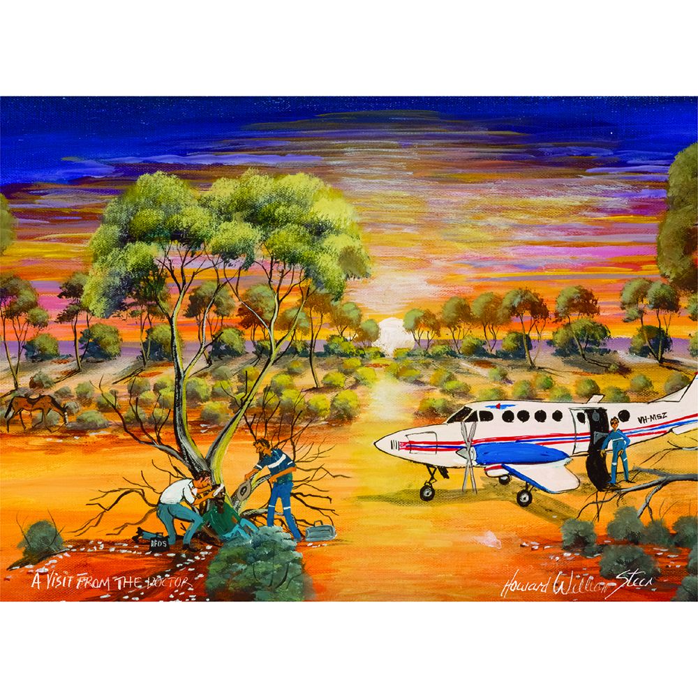 Howard William Steer developed the foundation for what he calls "Story Art, where each painting tells its own story. A prime example is the "Flying Doctor" series featuring a winged, black-suited saviour complete with top hat and bag. Howard's style is classified as naive realism.