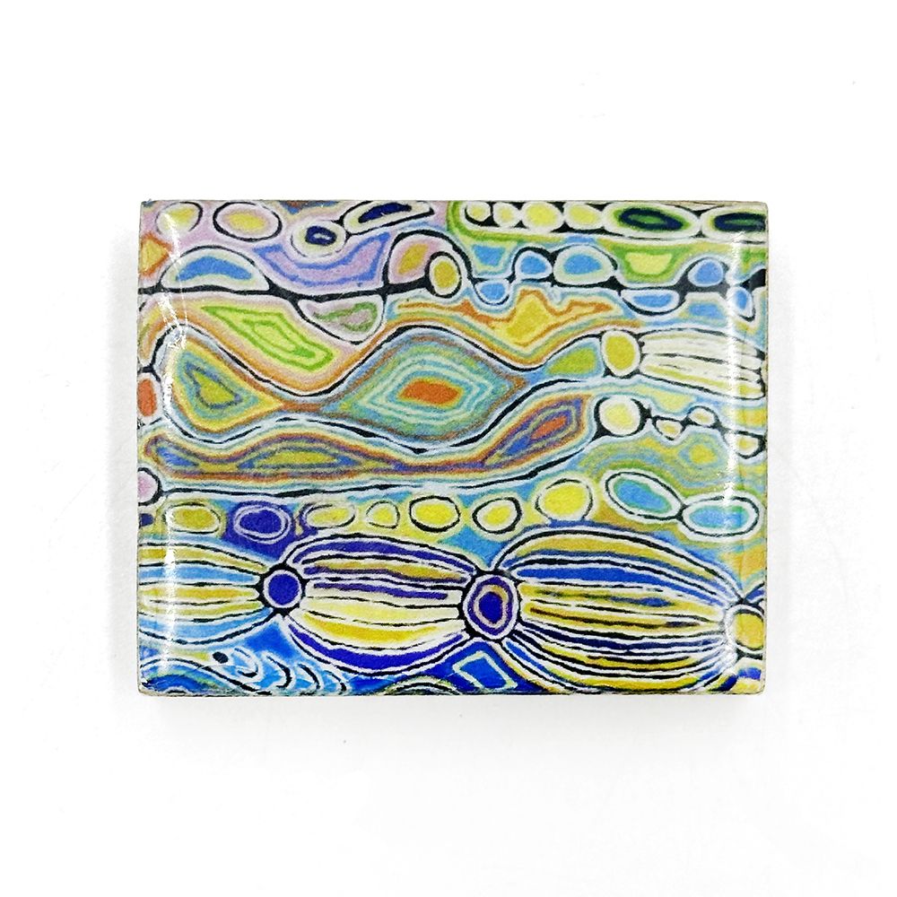 This story tells of the journey of a group of women of all ages who travelled to the east gathering food, collecting 'ngalyipi' (snake vine) and performing ceremonies as they travelled. The wavy lines represent the snake vine, the 'u' shapes the women, the circular shapes are edible mushrooms the women collect on their travels and the two straight lines in the middle represent digging sticks.