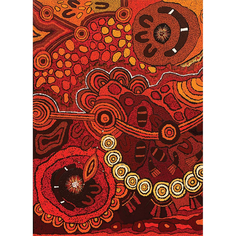 This piece tells the story of Yilpis grandfather and the hailstorm that killed him. As a young man he was stubborn and didn't listen to the elders that a big storm was coming. He went out hunting before the storm. He also wanted to perform a ceremonial dance to ward of the storm. He took the ceremonial dancing sticks, but didn't return. The rest of the clan hid in the caves to wait out the storm and afterwards, the women went searching for the man but could not find him. In another area of the country, the children were gathering bush foods and swimming in the newly filled rockholes. Quite by accident, they happened upon the body of the young man. He had died during the storm. This story is told to the children to teach them the importance of listening to their elders.