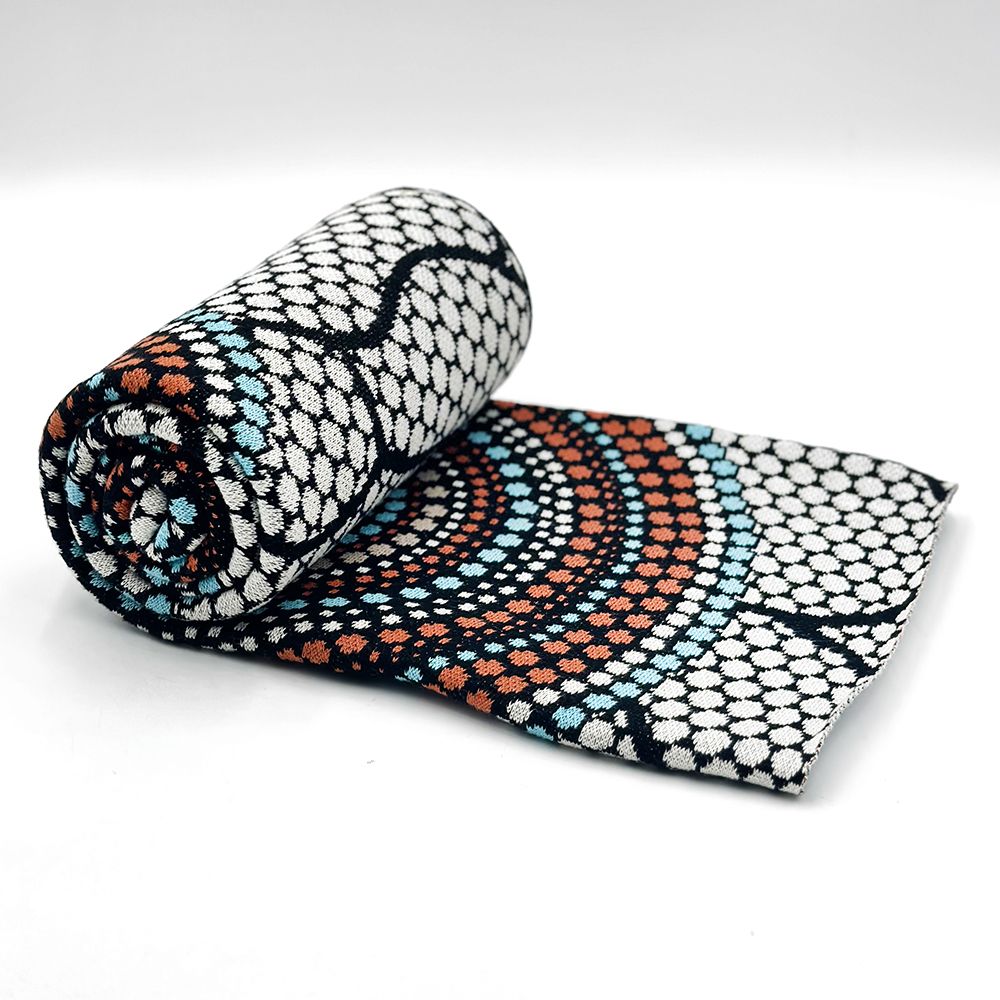 Using a gentle pallet of earth tones and blues Bianca describes the migration patterns of her ancestors that created a network of Aboriginal culture across Australia. Traditional migration patterns were age old, defined by various landmarks and natural resources. These migration patterns worked in harmony with the seasons and the natural environment.