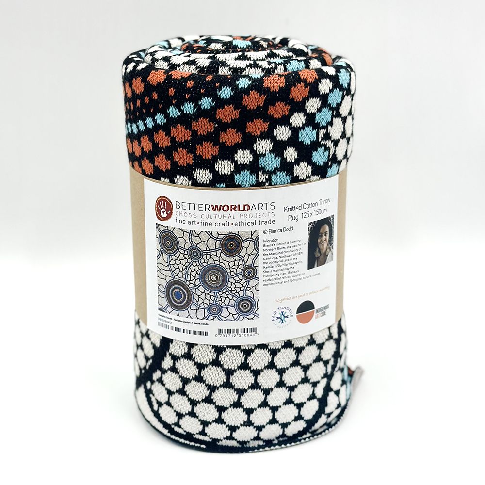 Using a gentle pallet of earth tones and blues Bianca describes the migration patterns of her ancestors that created a network of Aboriginal culture across Australia. Traditional migration patterns were age old, defined by various landmarks and natural resources. These migration patterns worked in harmony with the seasons and the natural environment.