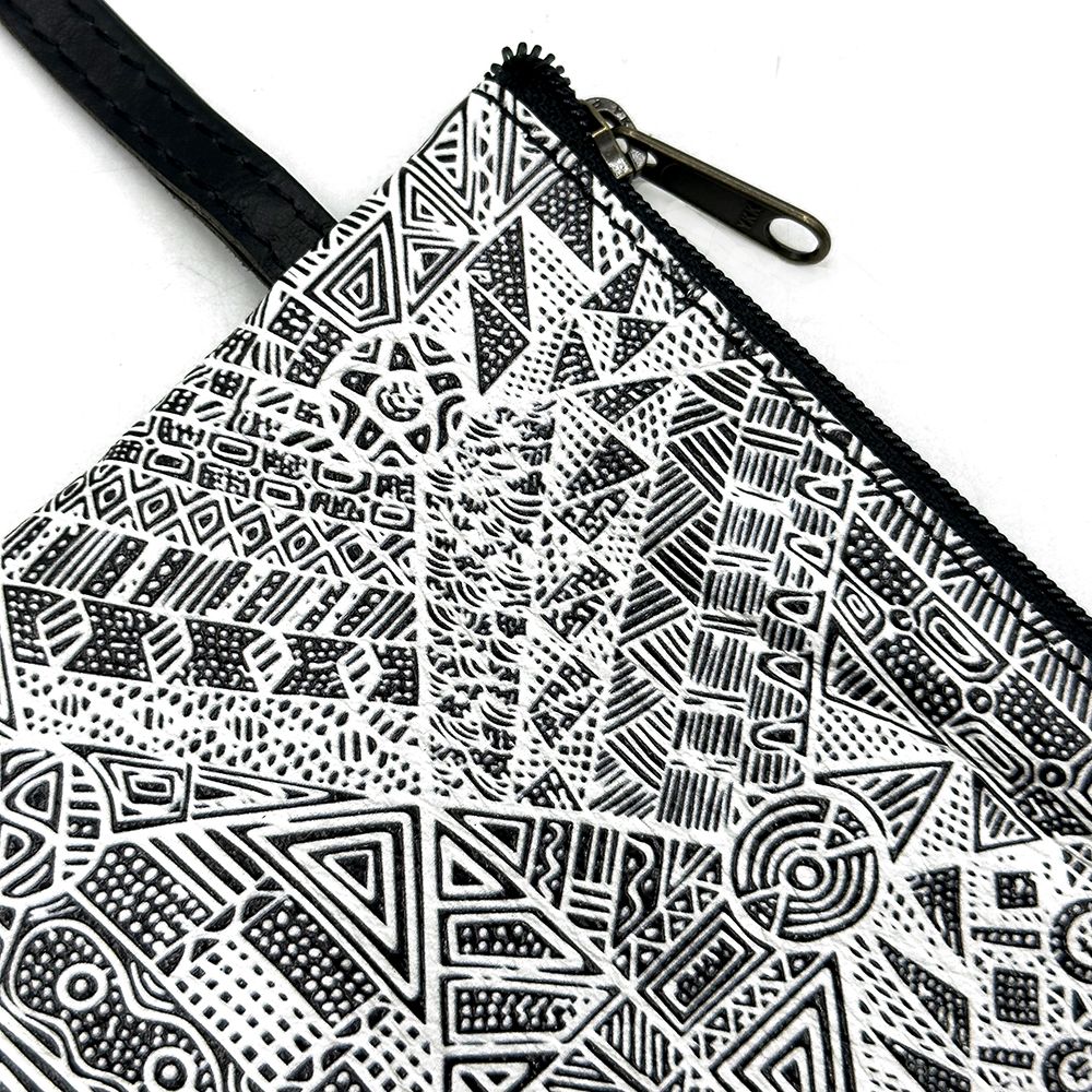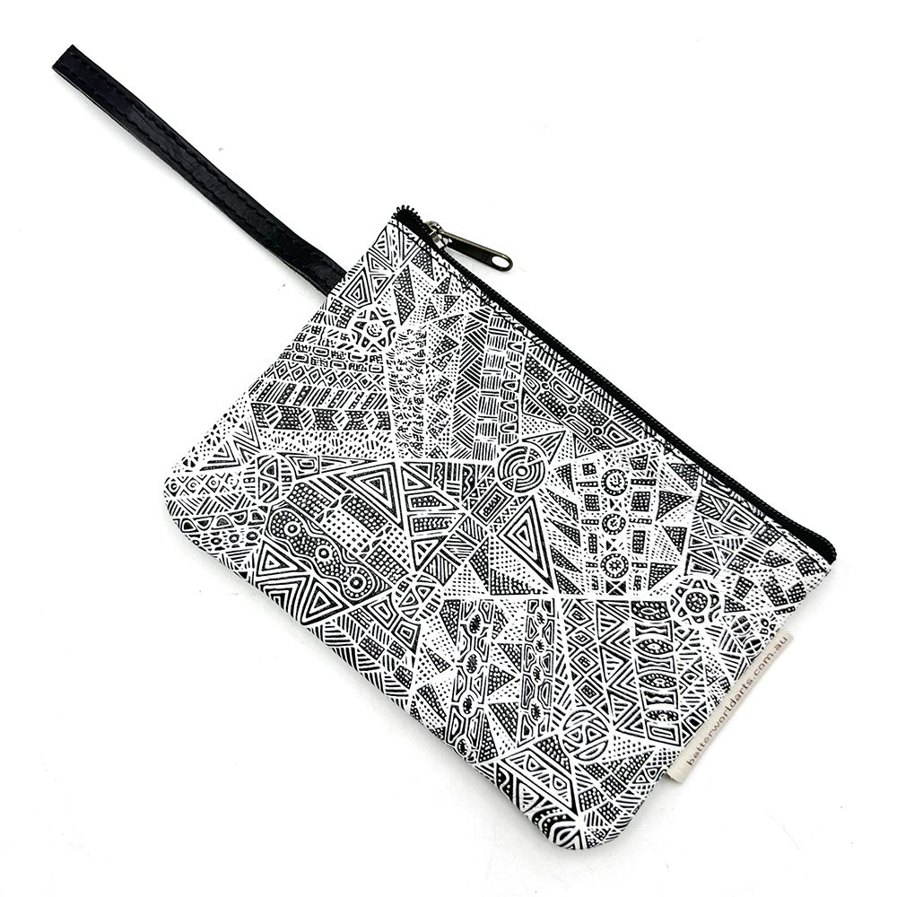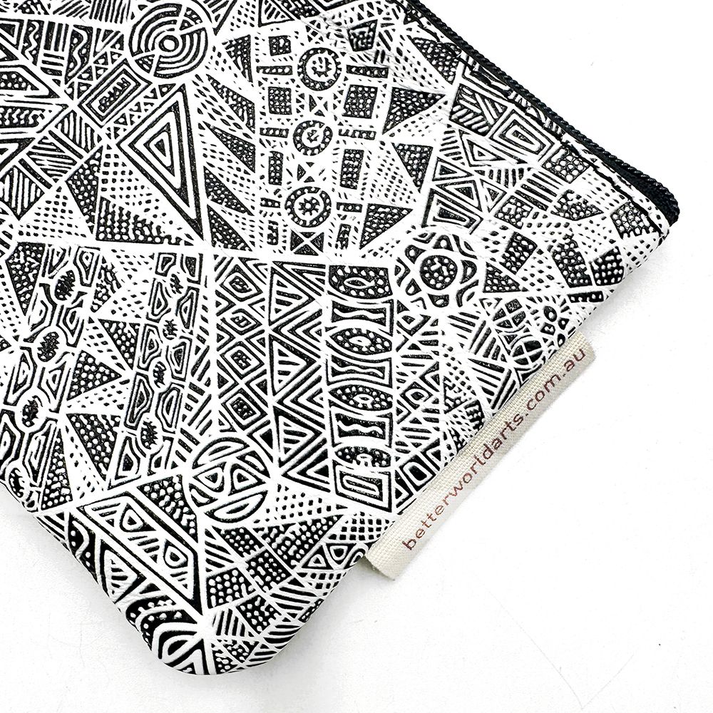 Simplicia paints a story about an old lady who travelled around with her six kids looking for food and water. When the old lady couldnt find anything, she started making a hole and then the water came out. Lots of different animals came to the waterhole. The old lady made four islands like Darwin, Bathurst and here (Melville Island). She made the waters and all the sea animals like crabs, barramundis, mud mussels, longbums, stingrays, turtles, dugongs, fishes that were good for food. Then she made the islands. The old lady travelled with her kids on her back, making the islands. Old and young people came and they were making a fire and dancing around it. They were happy for all the water everywhere.